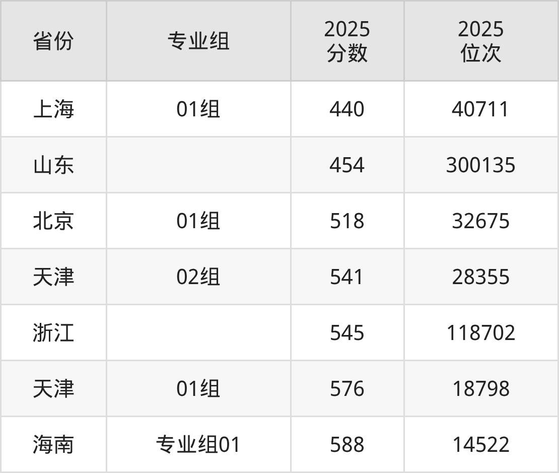 最低分对应地区为上海(01组),录取位次为40711,超本科线38分;最高分对应地区为海南(专业组01),录取位次为14522,超本科线108分。