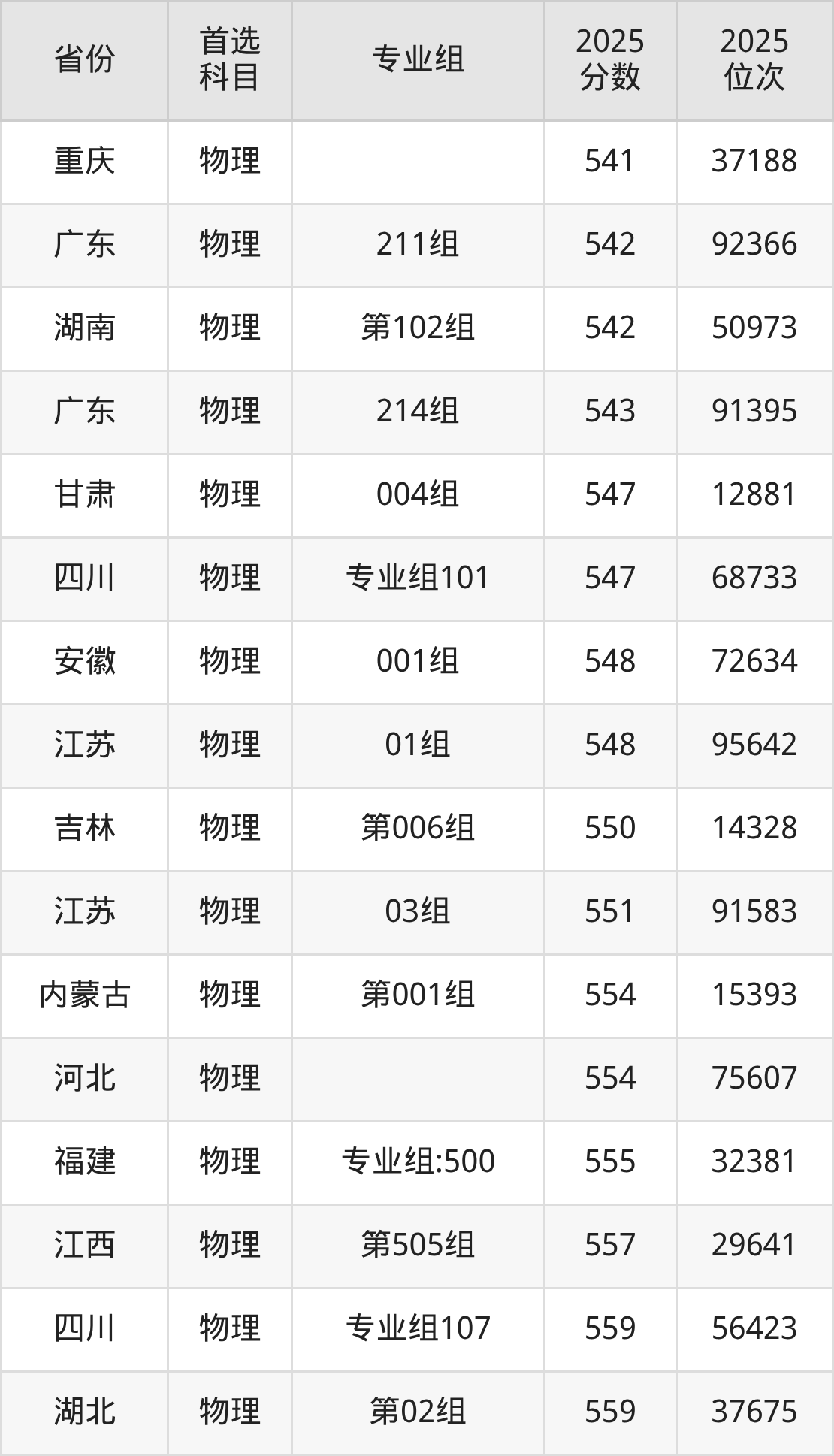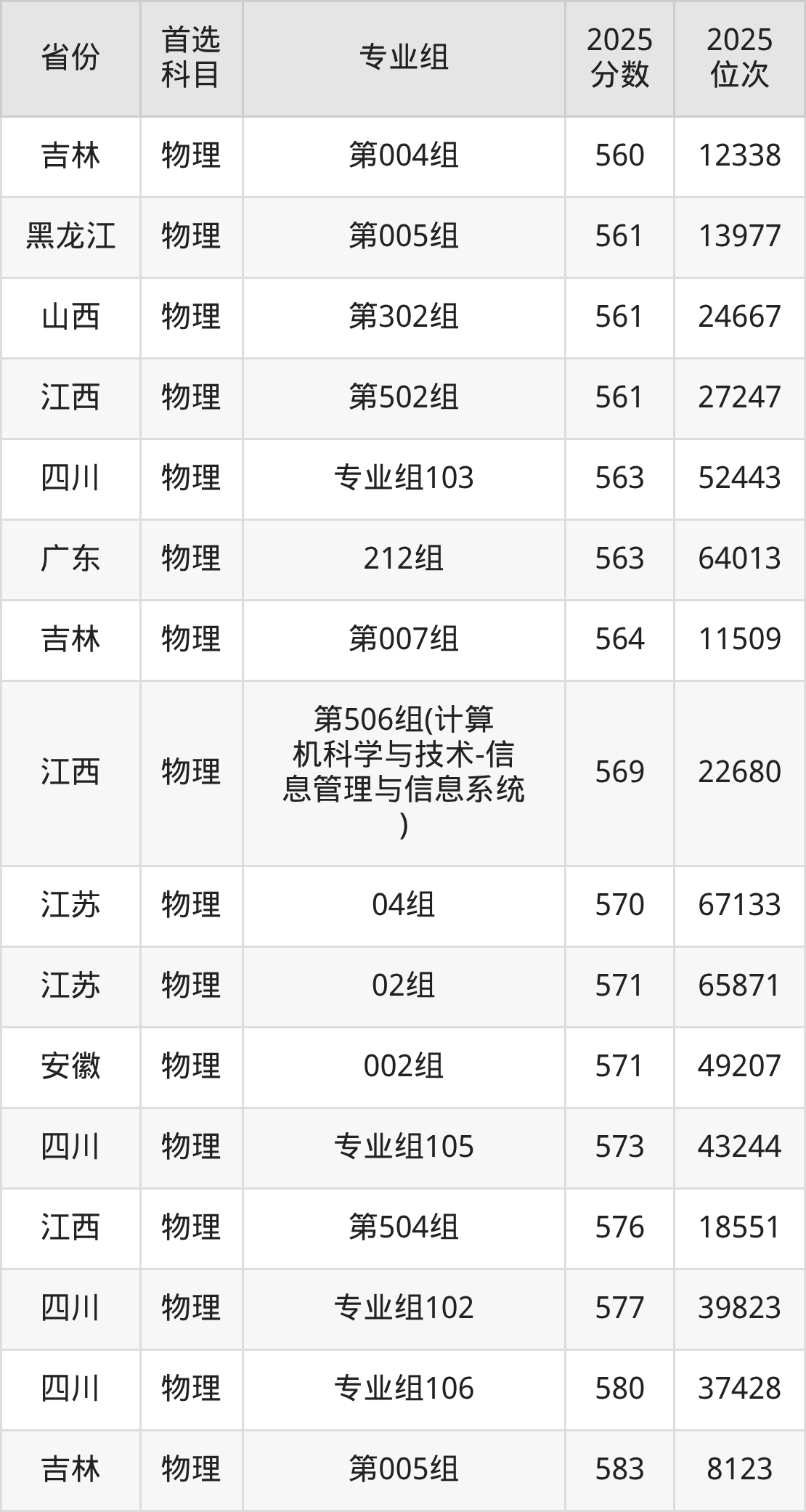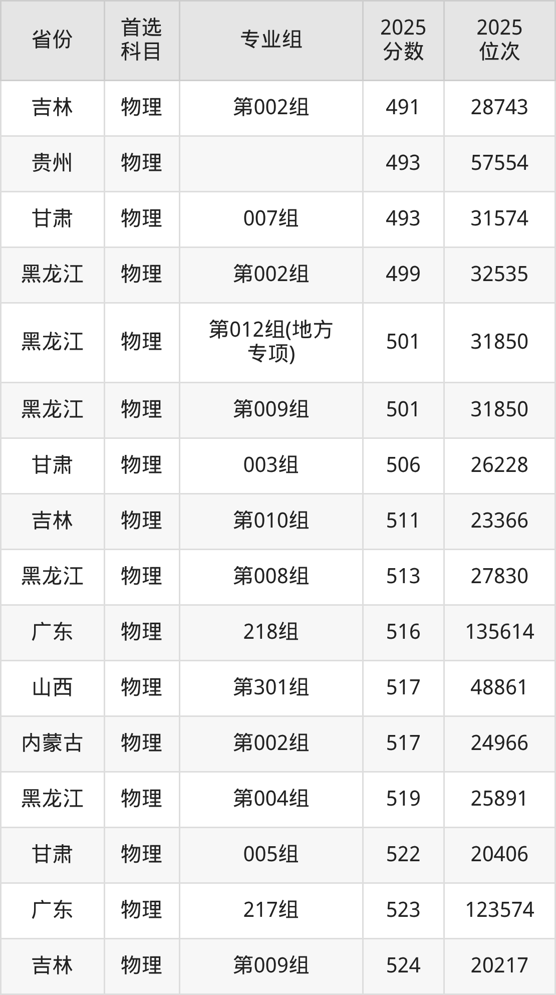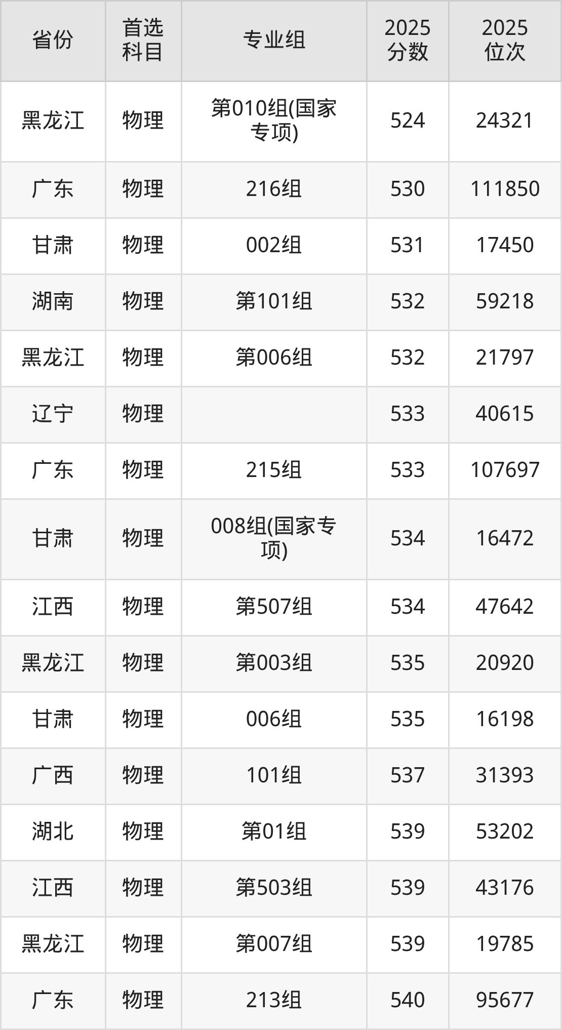 物理类:第002组499分、32535名,第003组535分、20920名,第004组519分、25891名,第005组561分、13977名,第006组532分、21797名,第007组539分、19785名,第008组513分、27830名,第009组501分、31850名,第010组(国家专项)524分、24321名,第011组(地方专项)449分、50394名,第012组(地方专项)501分、31850名;