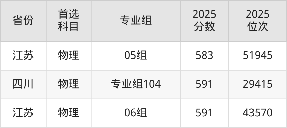 物理类最低分对应地区为吉林(第003组),录取位次为57354,超本科线53分;最高分对应地区为江苏(06组),录取位次为43570,超本科线128分。