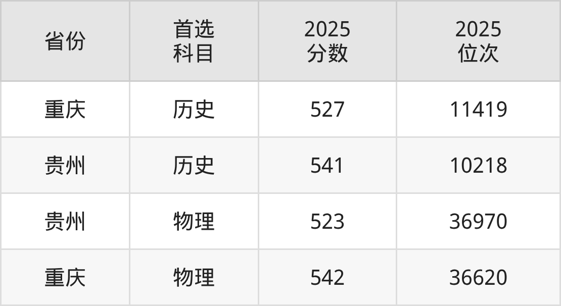 历史类最低分对应地区为重庆,录取位次为11419,超本科线89分;最高分对应地区为贵州,录取位次为10218,超本科线83分。