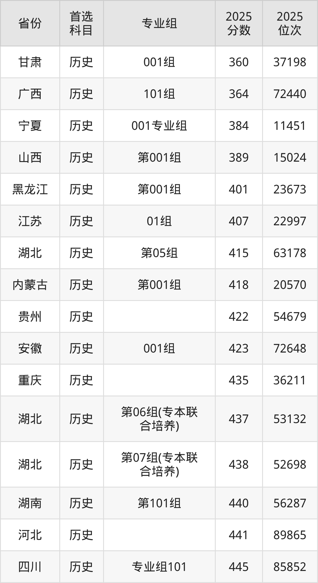 历史类:第05组415分、63178名,第06组(专本联合培养)437分、53132名,第07组(专本联合培养)438分、52698名;