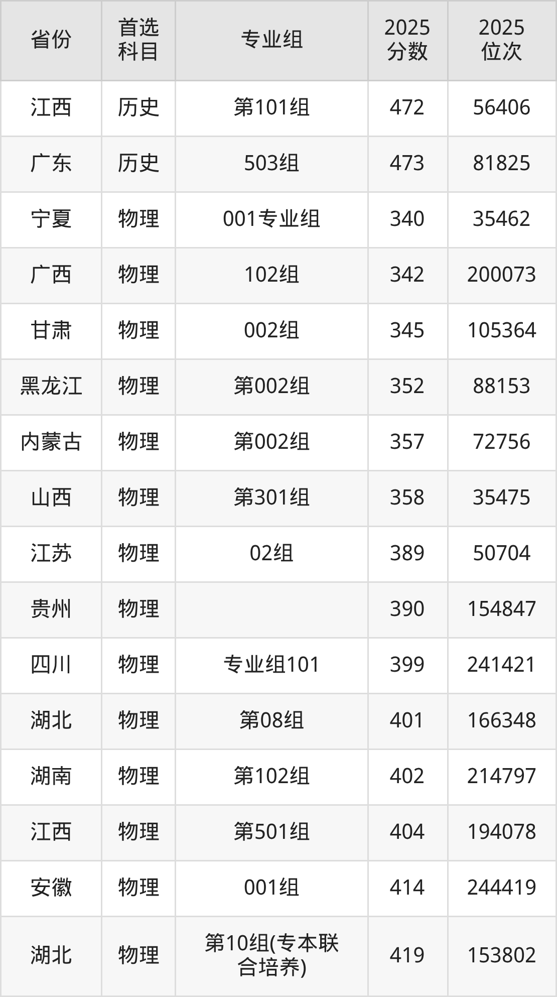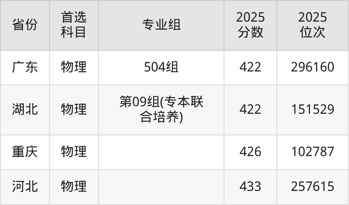 物理类:第08组401分、166348名,第09组(专本联合培养)422分、151529名,第10组(专本联合培养)419分、153802名;