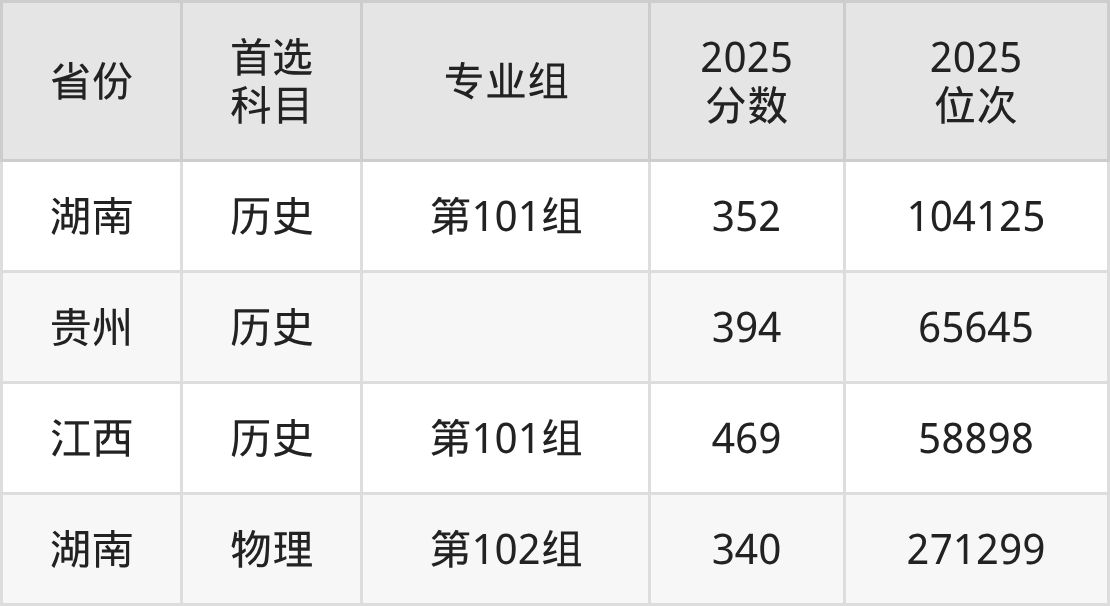 历史类最低分对应地区为湖南(第101组),录取位次为104125,超专科线152分;最高分对应地区为江西(第101组),录取位次为58898,超专科线179分。
