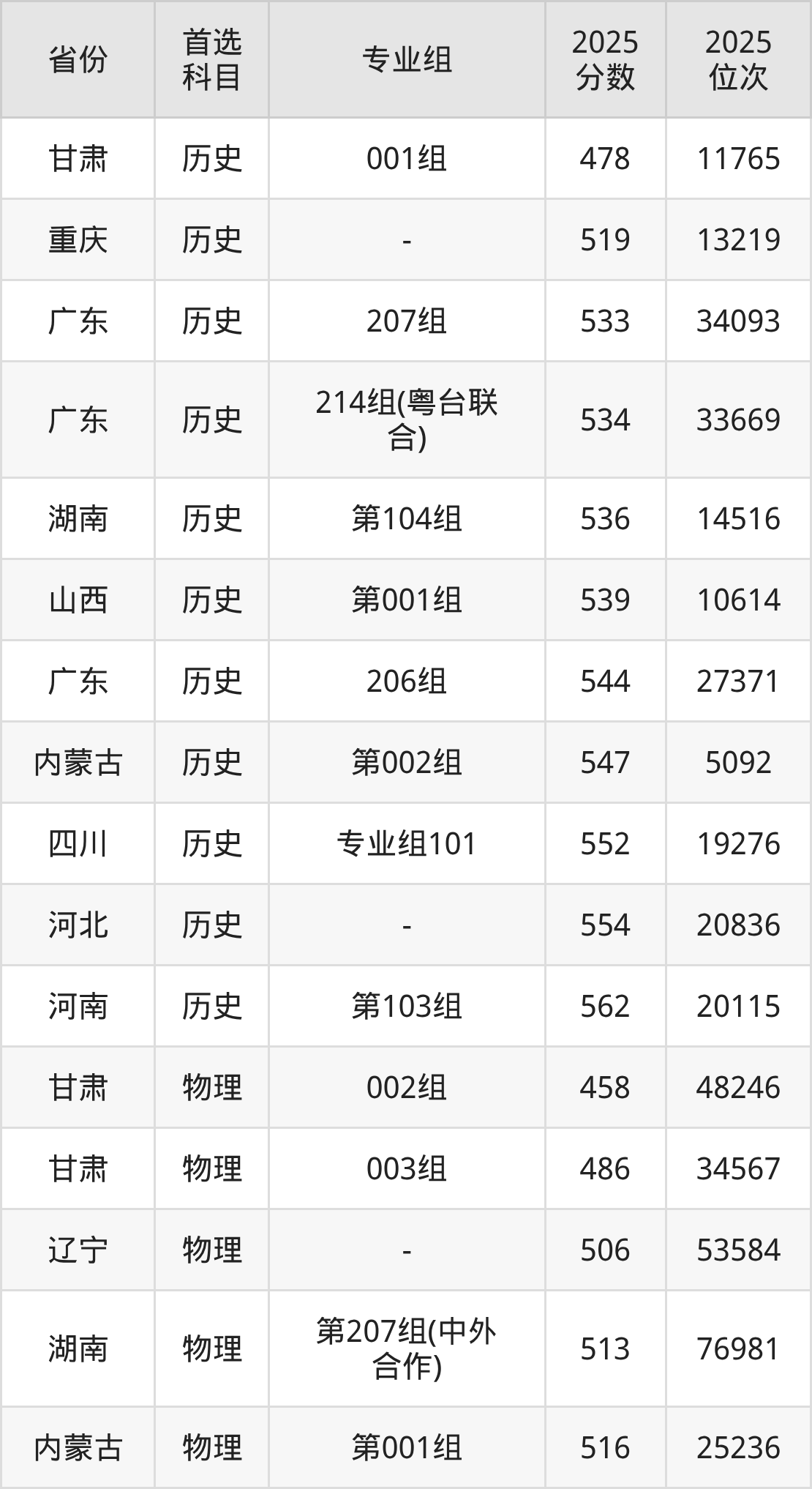 历史类最低分对应地区为甘肃(001组),录取位次为11765,超本科线66分;最高分对应地区为河南(第103组),录取位次为20115,超本科线91分。