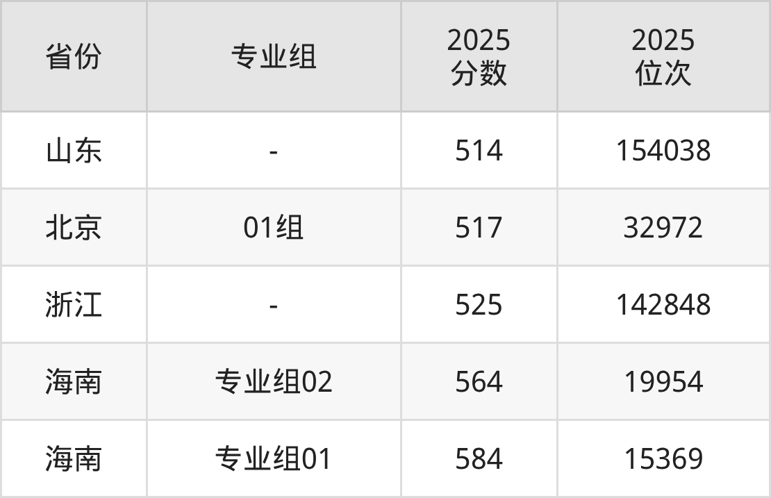 最低分对应地区为山东,录取位次为154038,超一段线91分;最高分对应地区为海南(专业组01),录取位次为15369,超本科线104分。