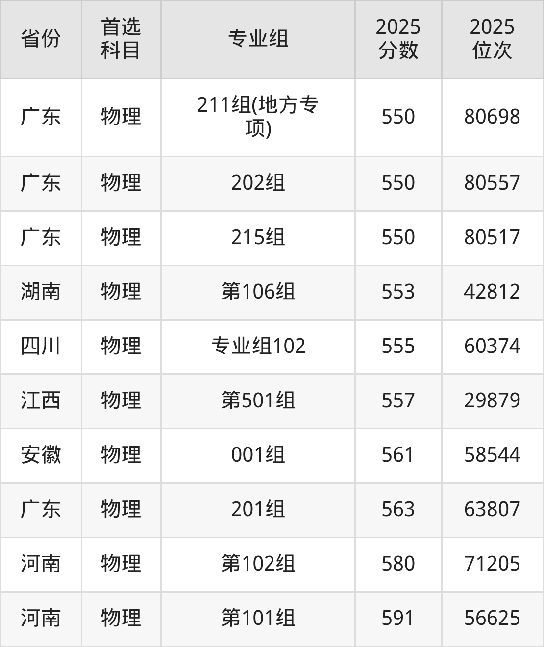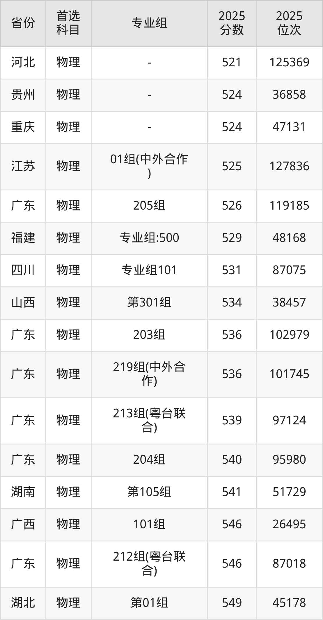 物理类:201组563分、63807名,202组550分、80557名,203组536分、102979名,204组540分、95980名,205组526分、119185名,211组(地方专项)550分、80698名,212组(粤台联合)546分、87018名,213组(粤台联合)539分、97124名,215组550分、80517名,219组(中外合作)536分、101745名;