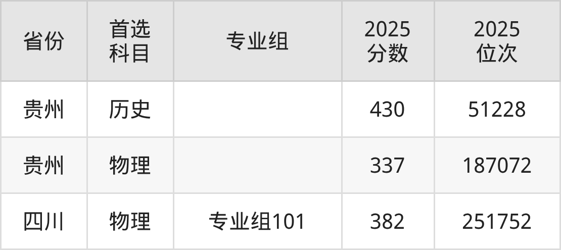 物理类最低分对应地区为贵州,录取位次为187072,超专科线157分;最高分对应地区为四川(专业组101),录取位次为251752,超专科线232分。