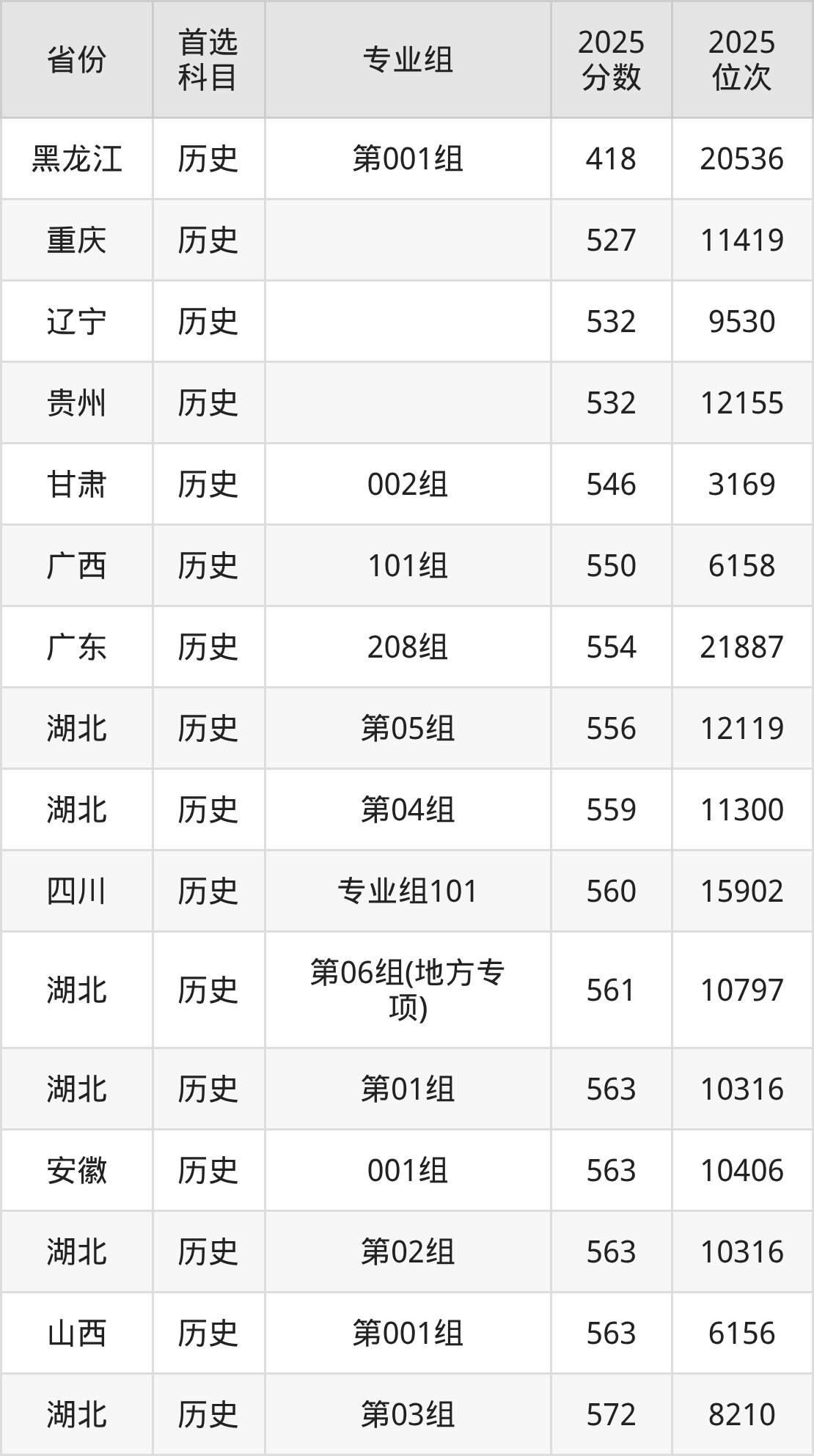历史类最低分对应地区为黑龙江(第001组),录取位次为20536,超本科线13分;最高分对应地区为江西(第101组),录取位次为6416,超本科线86分。