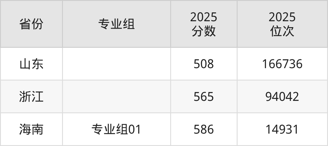 最低分对应地区为山东,录取位次为166736,超一段线107分;最高分对应地区为海南(专业组01),录取位次为14931,超本科线106分。