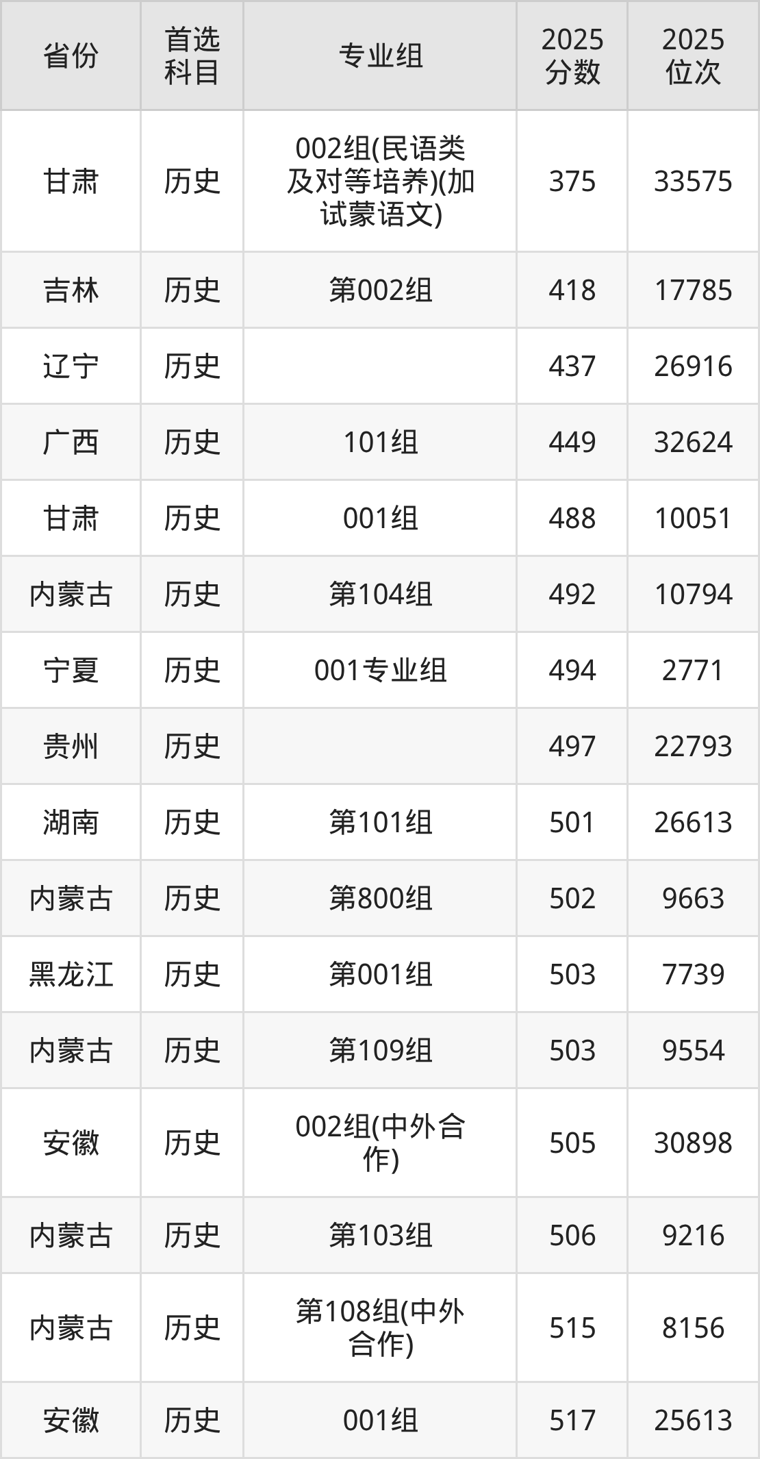 历史类最低分对应地区为甘肃(002组(民语类及对等培养)(加试蒙语文)),录取位次为33575,低本科线37分;最高分对应地区为河北,录取位次为20836,超本科线77分。