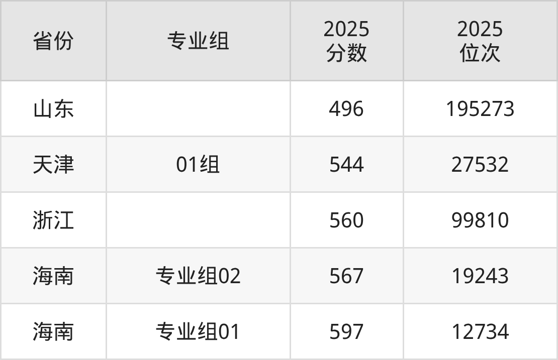 最低分对应地区为山东,录取位次为195273,超一段线55分;最高分对应地区为海南(专业组01),录取位次为12734,超本科线117分。