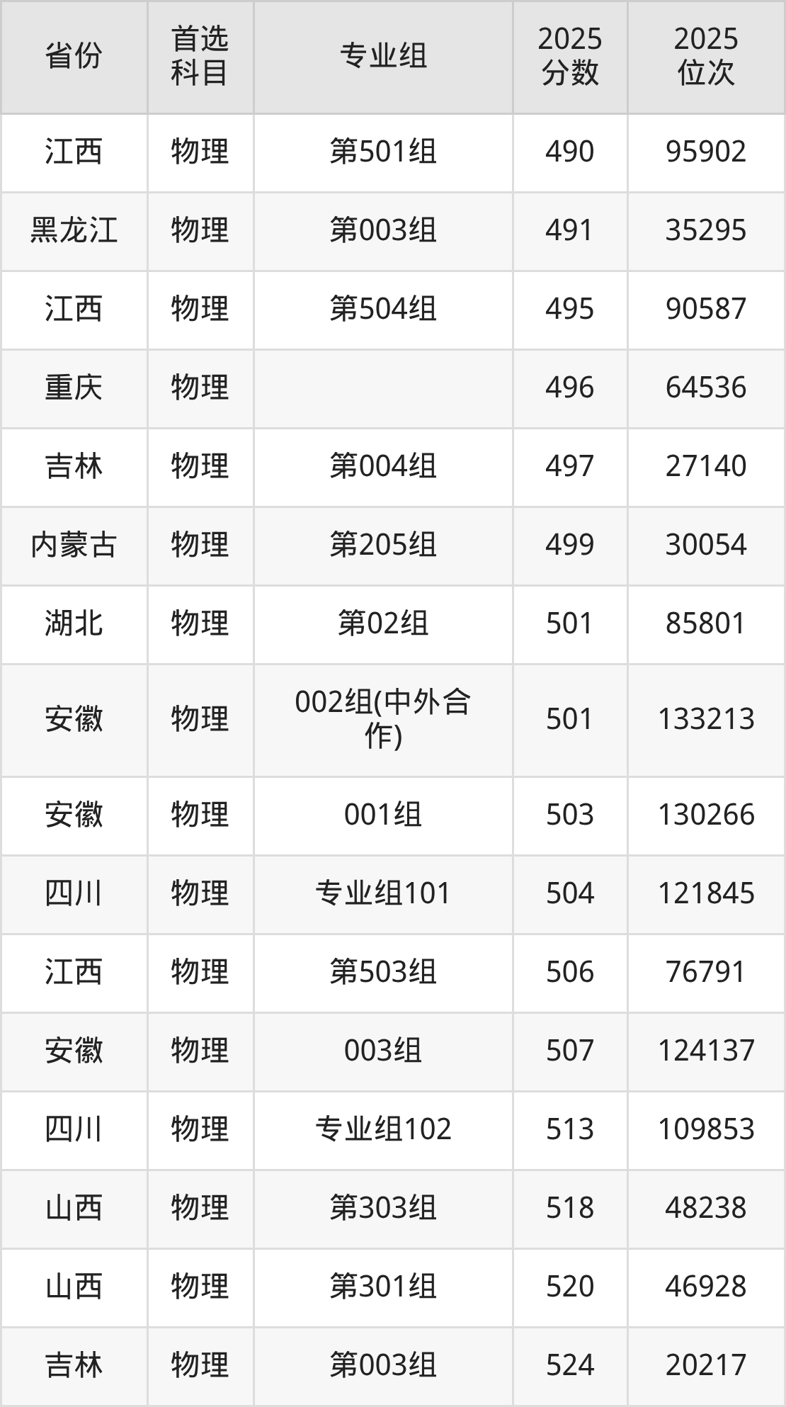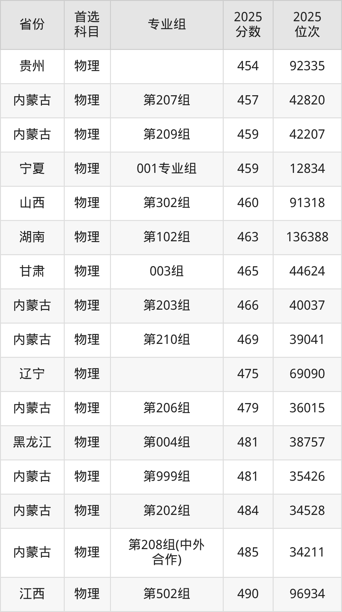 物理类:第201组532分、20815名,第202组484分、34528名,第203组466分、40037名,第204组445分、46700名,第205组499分、30054名,第206组479分、36015名,第207组457分、42820名,第208组(中外合作)485分、34211名,第209组459分、42207名,第210组469分、39041名,第999组481分、35426名;