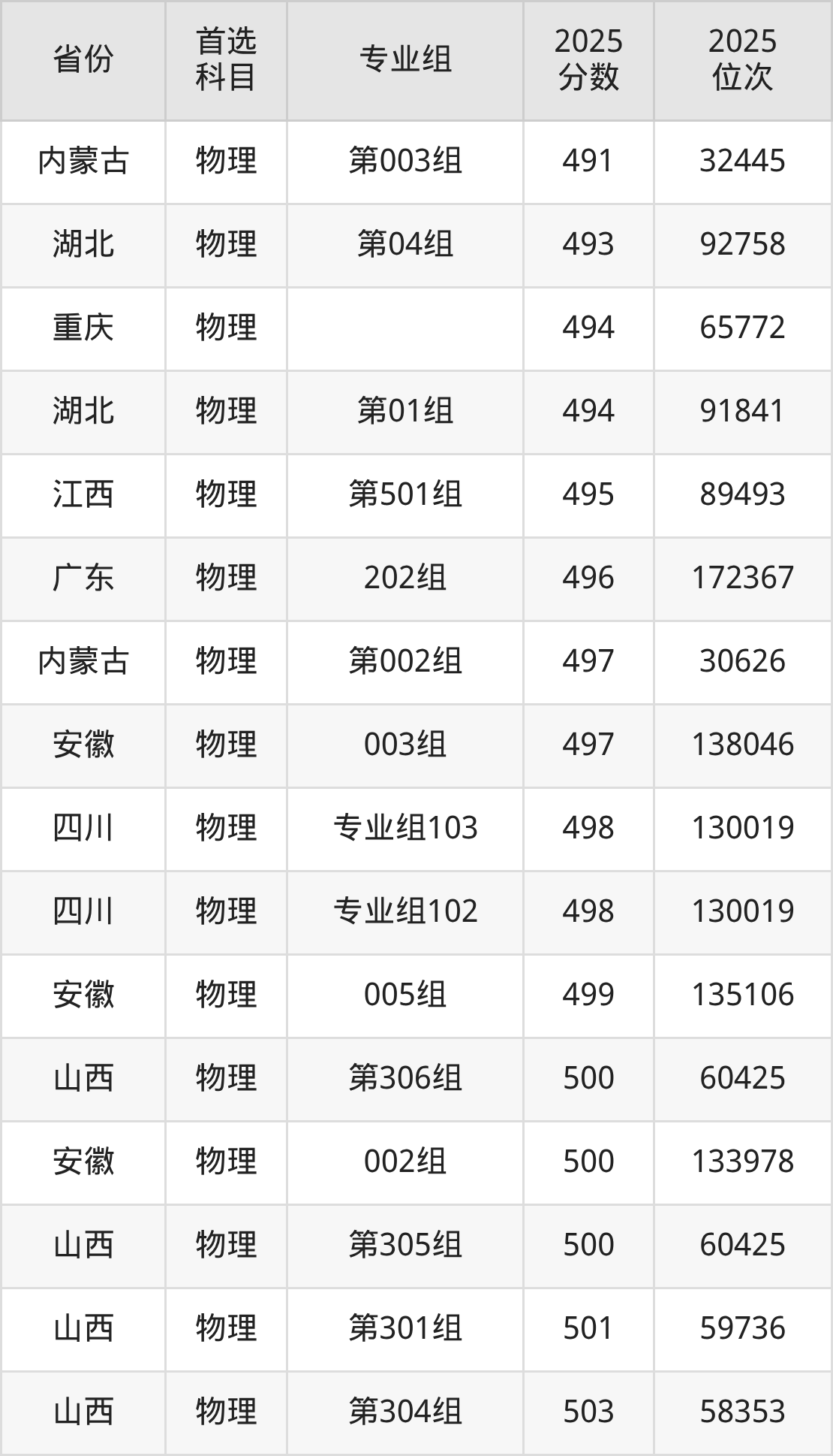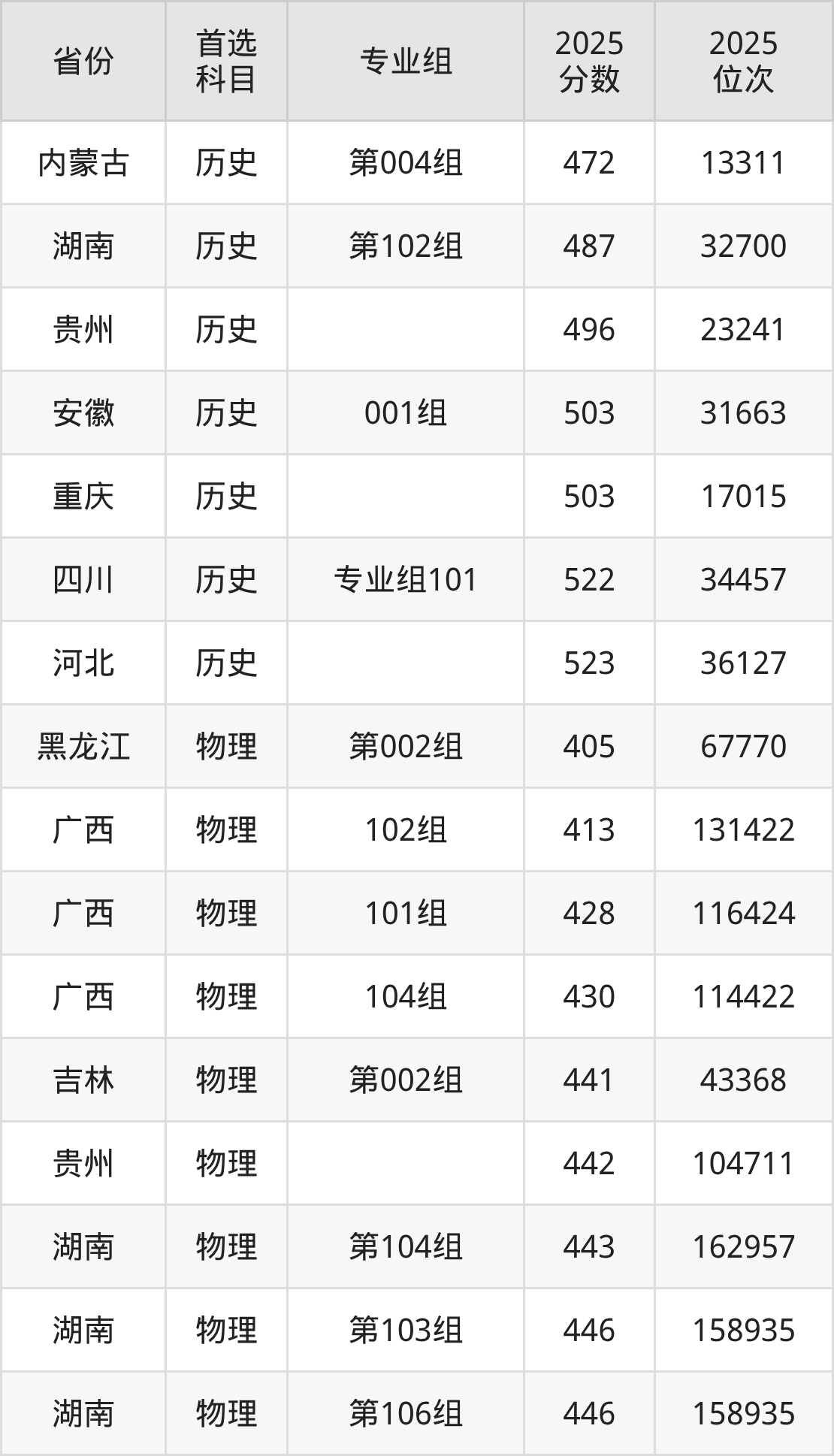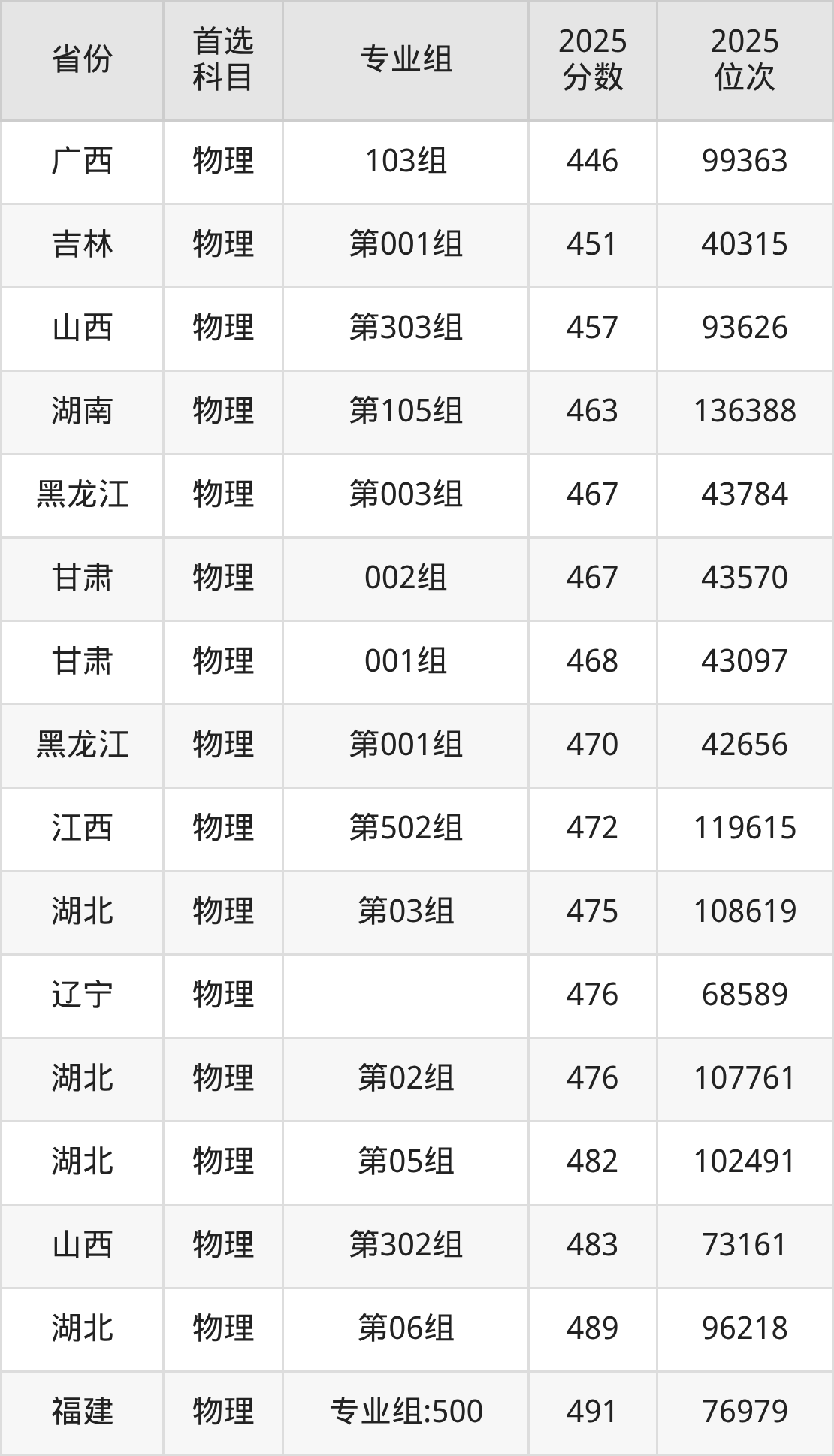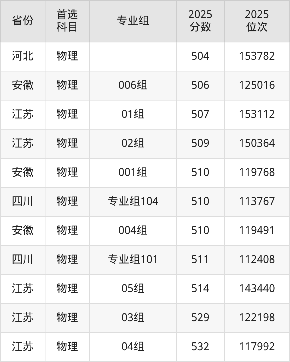 物理类最低分对应地区为黑龙江(第002组),录取位次为67770,超本科线45分;最高分对应地区为江苏(04组),录取位次为117992,超本科线69分。