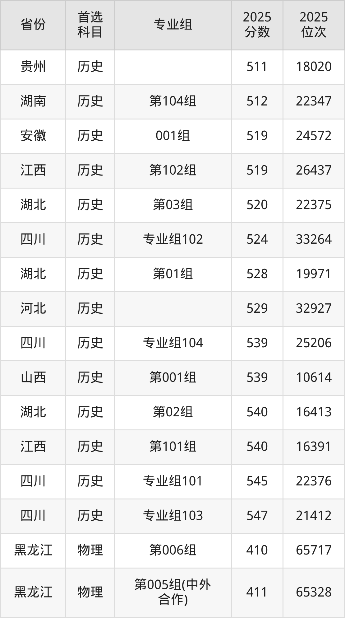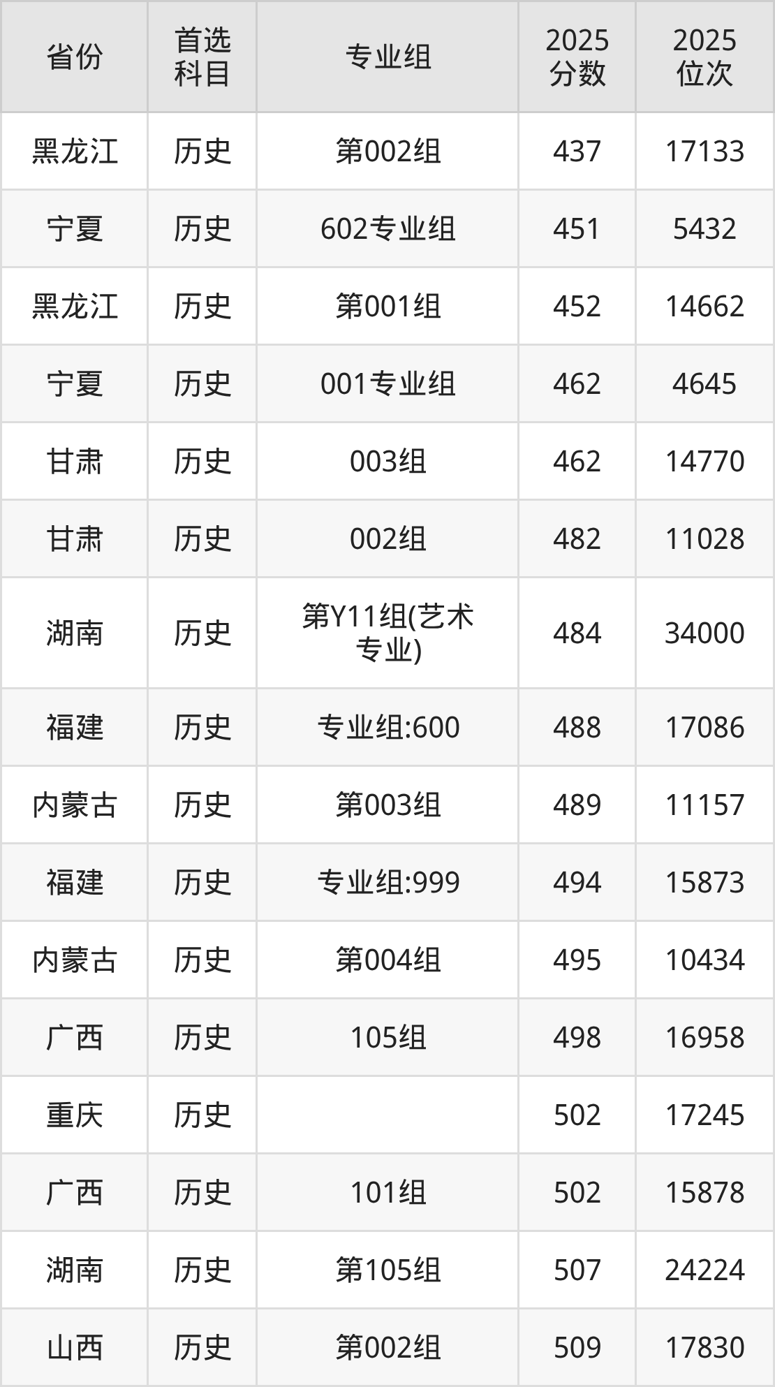 历史类最低分对应地区为黑龙江(第002组),录取位次为17133,超本科线32分;最高分对应地区为四川(专业组103),录取位次为21412。