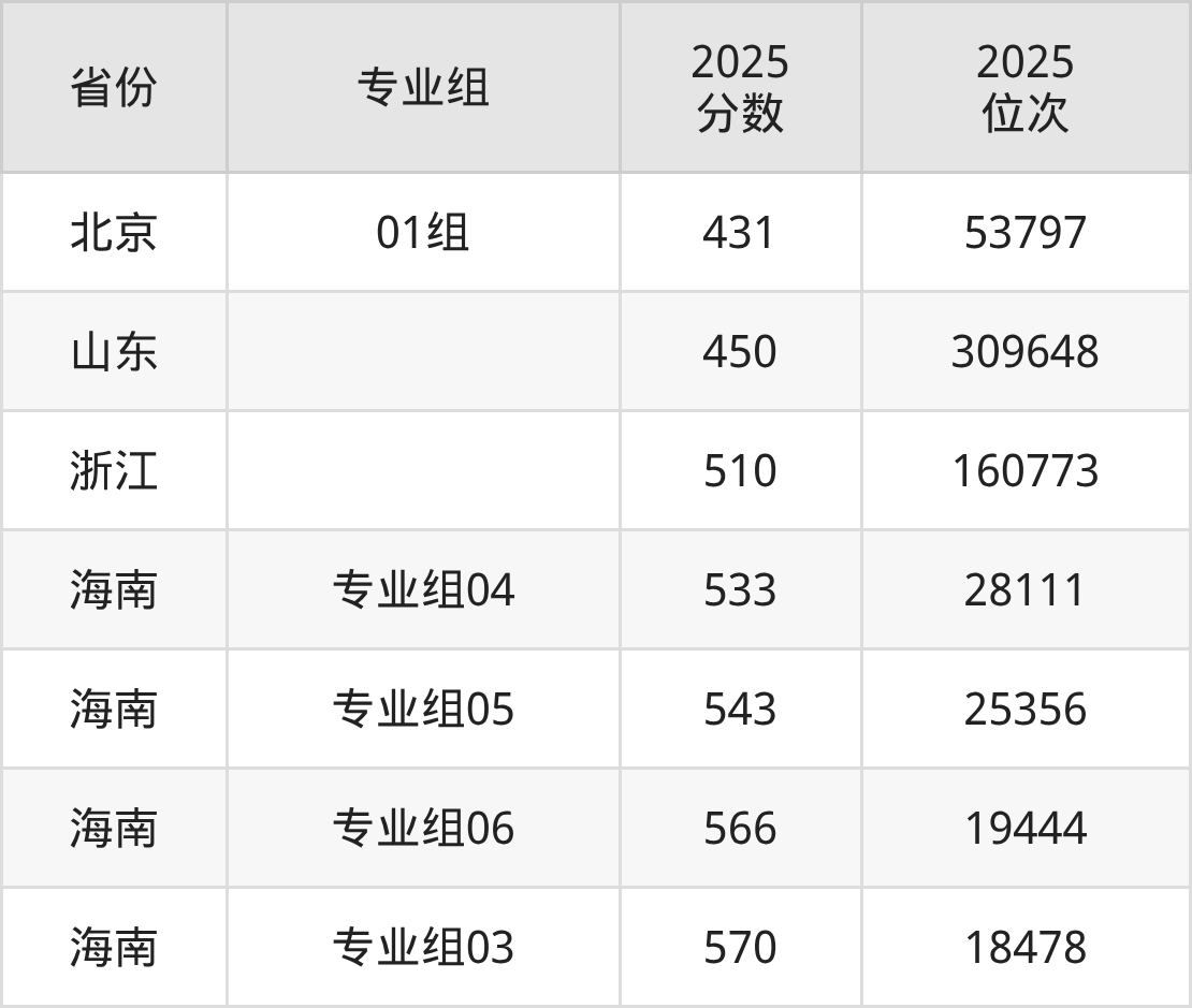 最低分对应地区为北京(01组),录取位次为53797,超本科线1分;最高分对应地区为海南(专业组03),录取位次为18478。