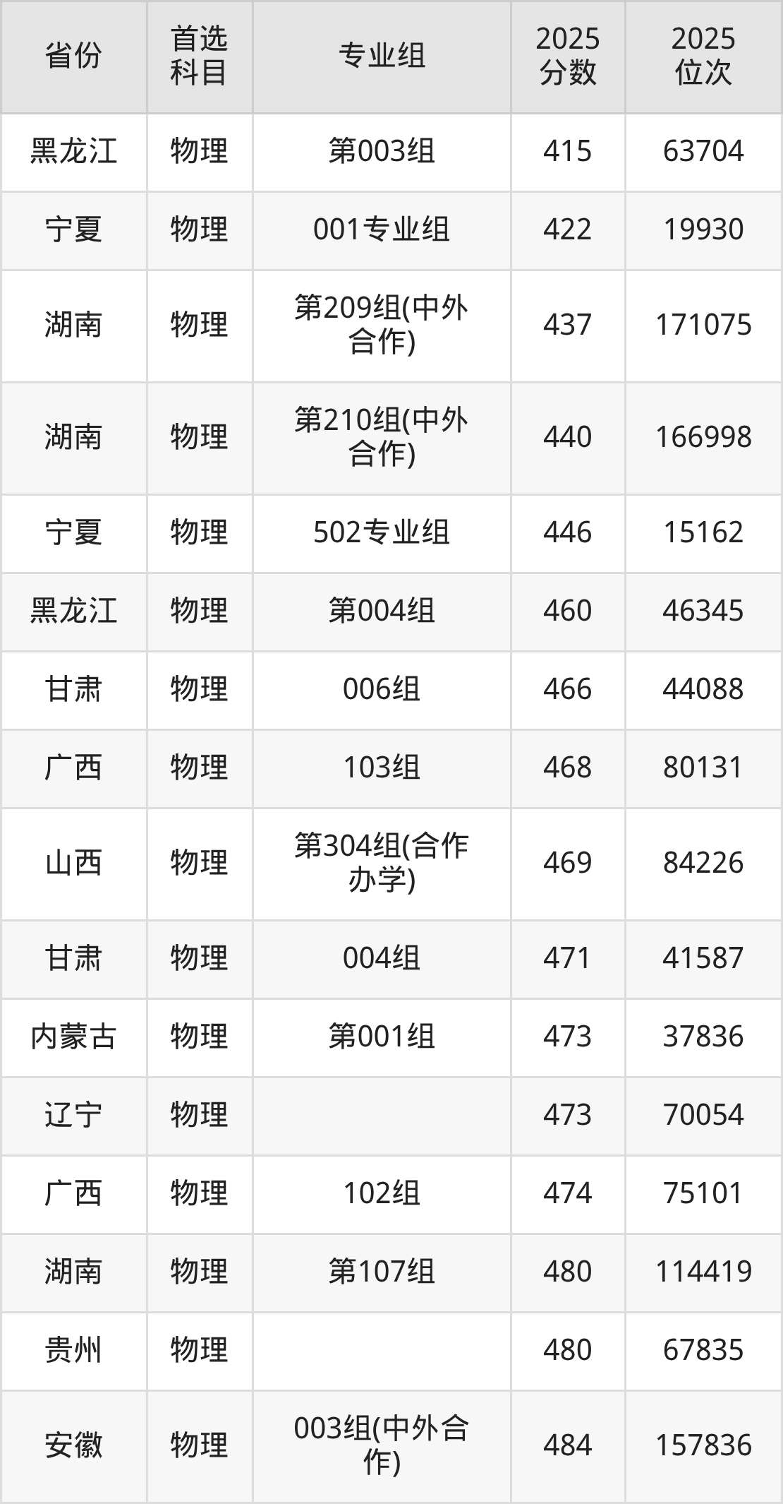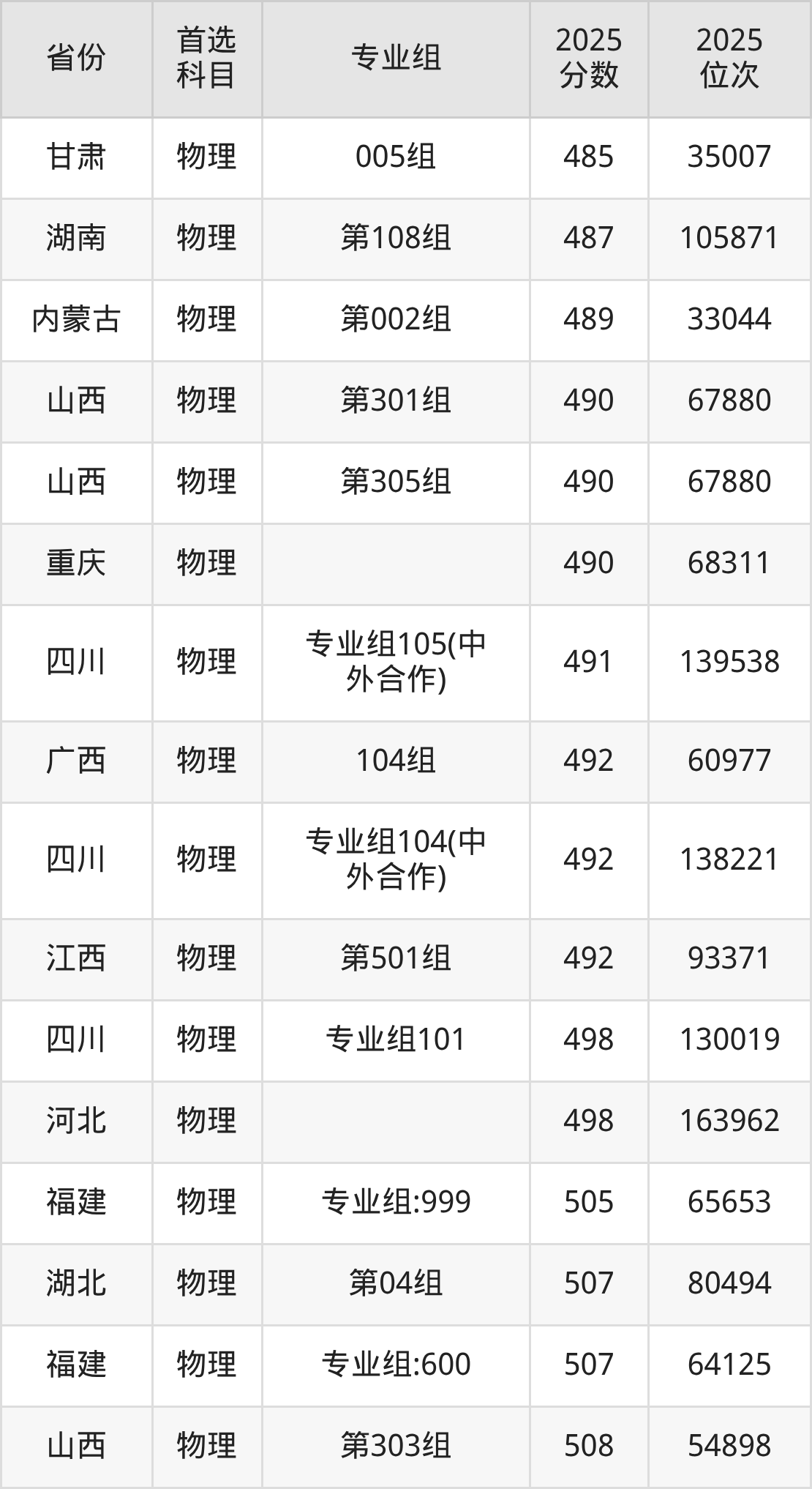 物理类最低分对应地区为黑龙江(第006组),录取位次为65717;最高分对应地区为四川(专业组103),录取位次为87075,超本科B93分。