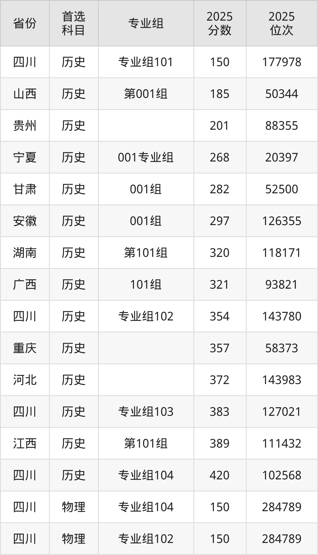历史类最低分对应地区为四川(专业组101),录取位次为177978;最高分对应地区为四川(专业组104),录取位次为102568。