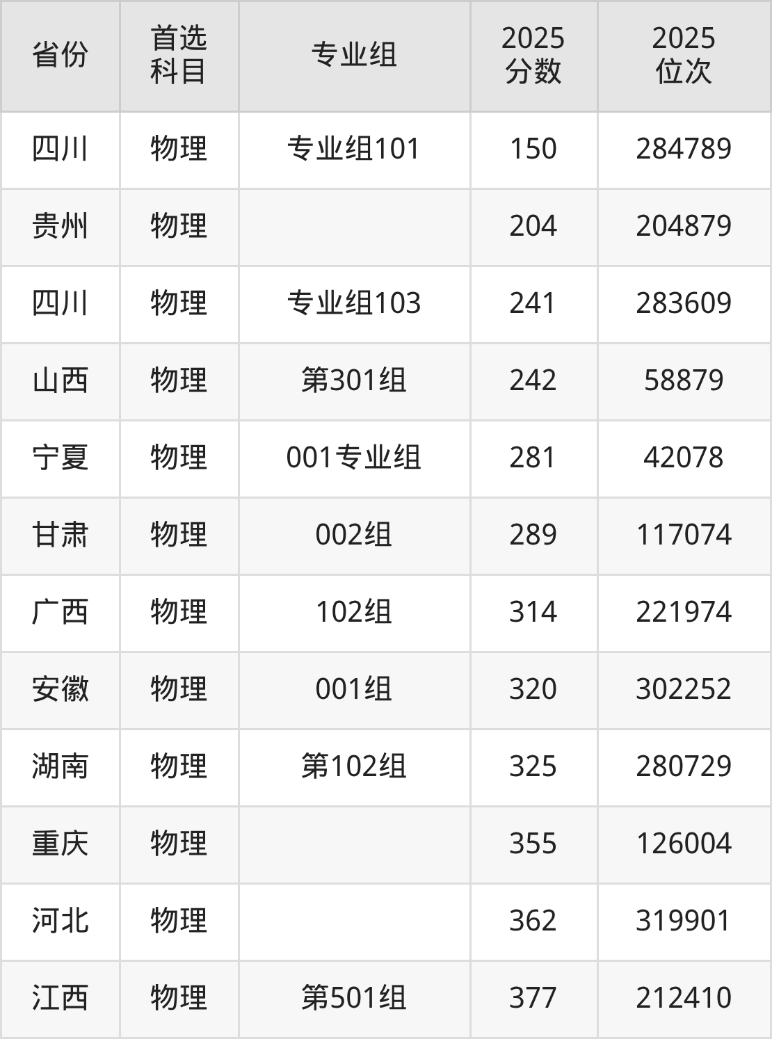物理类最低分对应地区为四川(专业组104),录取位次为284789;最高分对应地区为江西(第501组),录取位次为212410,超专科线137分。
