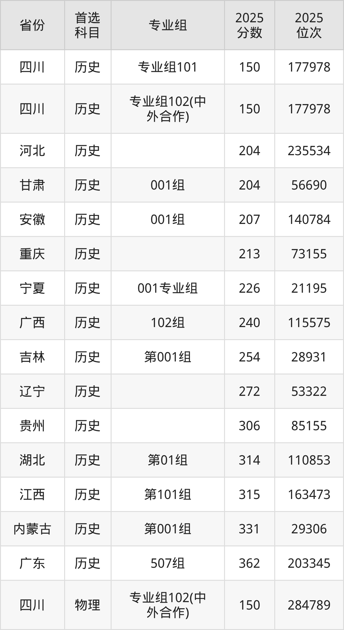 历史类:专业组101150分、177978名,专业组102(中外合作)150分、177978名;