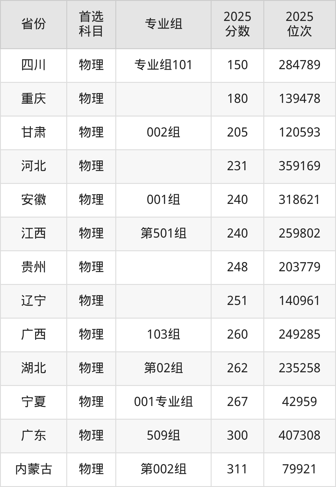 物理类:专业组101150分、284789名,专业组102(中外合作)150分、284789名;