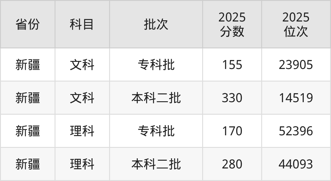 理科最低分对应地区为新疆,录取位次为52396;最高分对应地区为新疆,录取位次为44093。