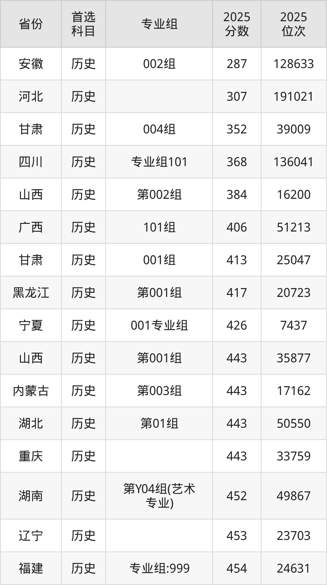 历史类最低分对应地区为安徽(002组),录取位次为128633,超专科线87分;最高分对应地区为江苏(01组),录取位次为53482,超本科线6分。