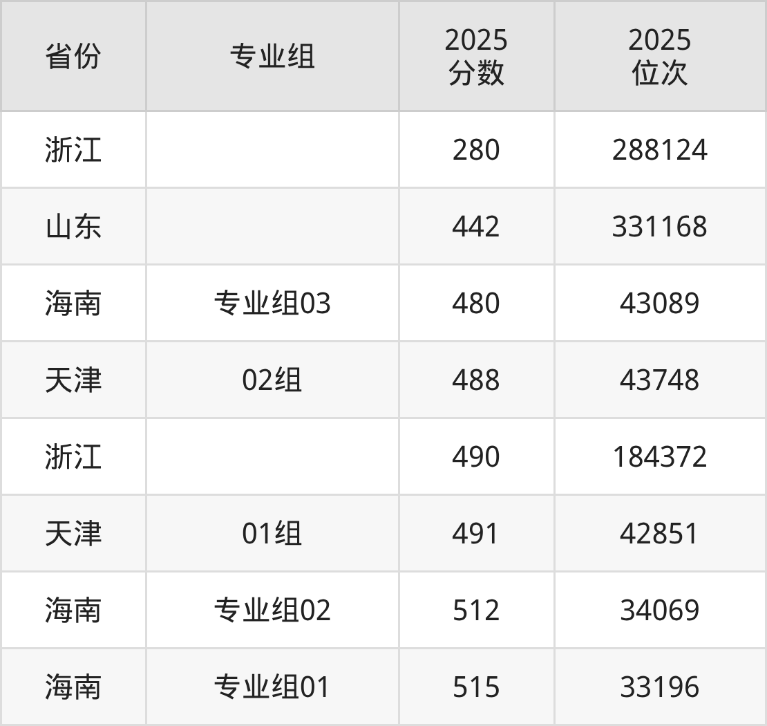 最低分对应地区为浙江,录取位次为288124,超二段线12分;最高分对应地区为海南(专业组01),录取位次为33196,超本科线35分。
