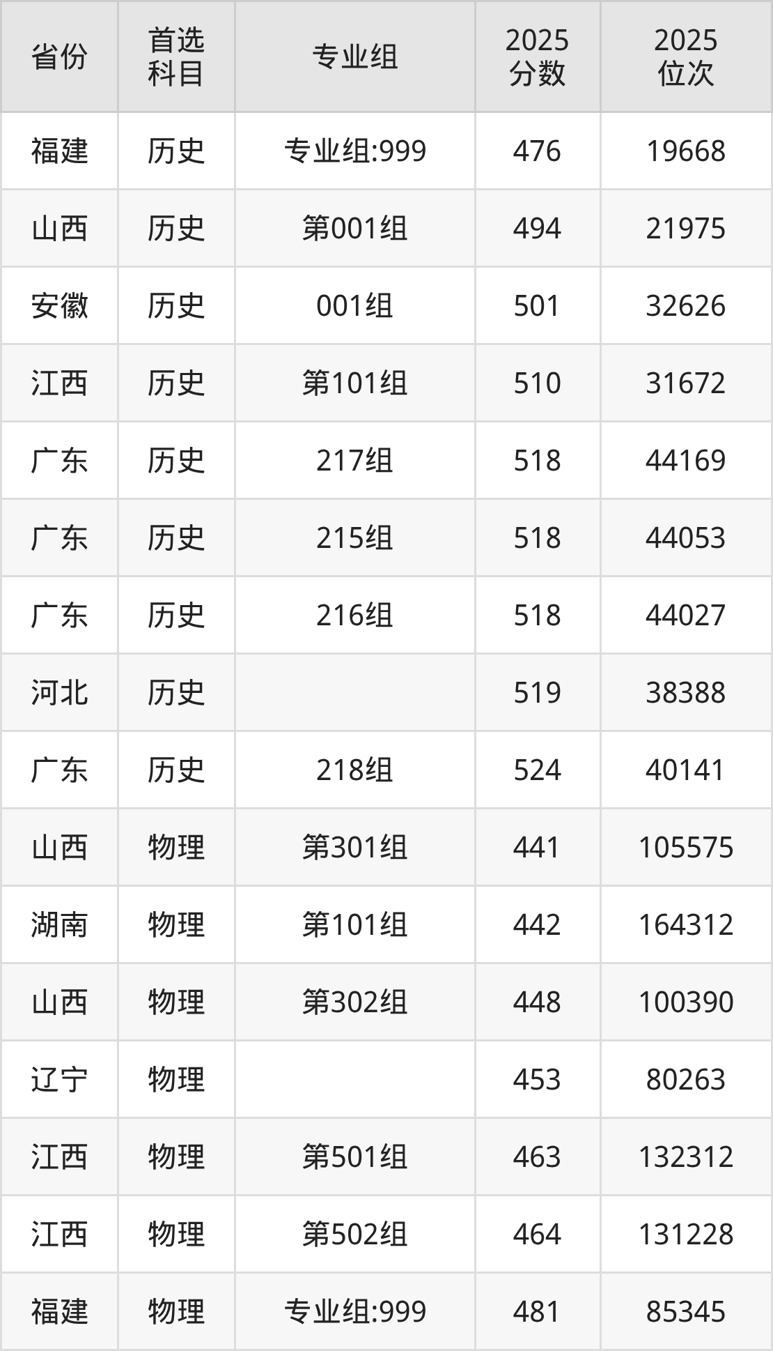 历史类最低分对应地区为福建(专业组:999),录取位次为19668,超本科线26分;最高分对应地区为广东(218组),录取位次为40141。