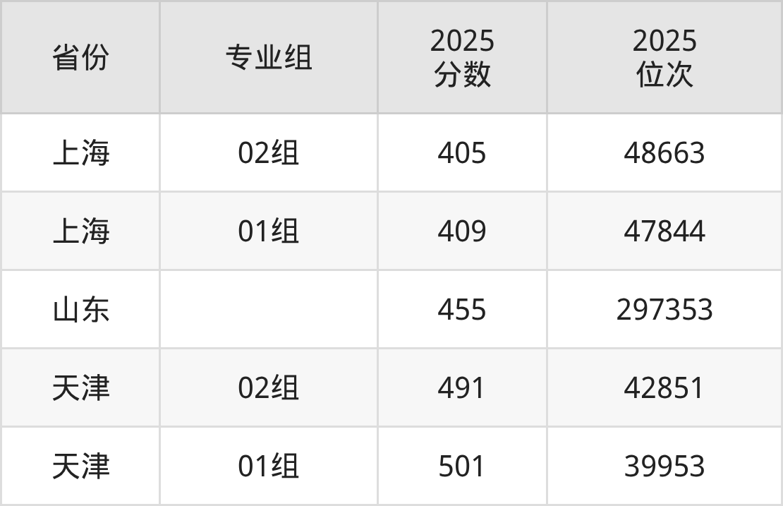 最低分对应地区为上海(02组),录取位次为48663,超本科线3分;最高分对应地区为天津(01组),录取位次为39953,超本科线25分。