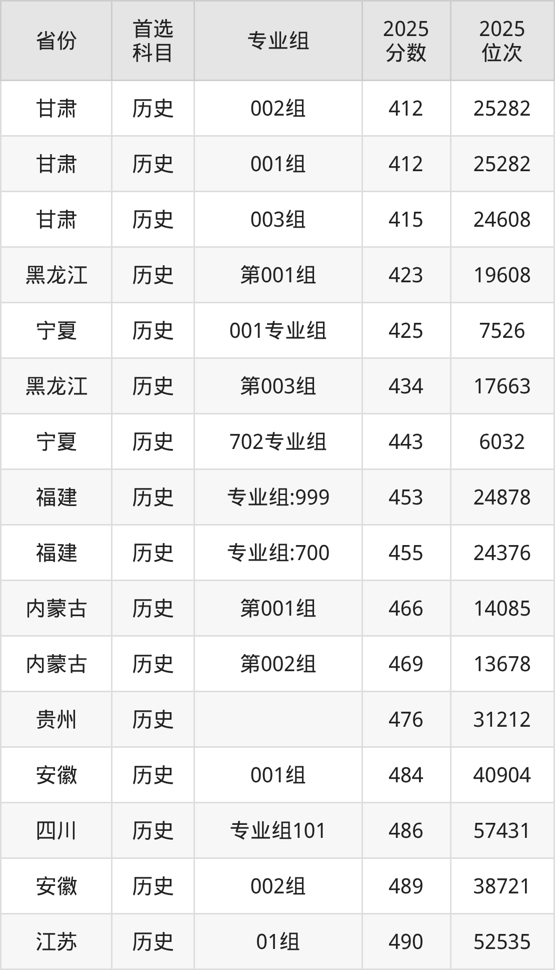 历史类:001组412分、25282名,002组412分、25282名,003组415分、24608名;