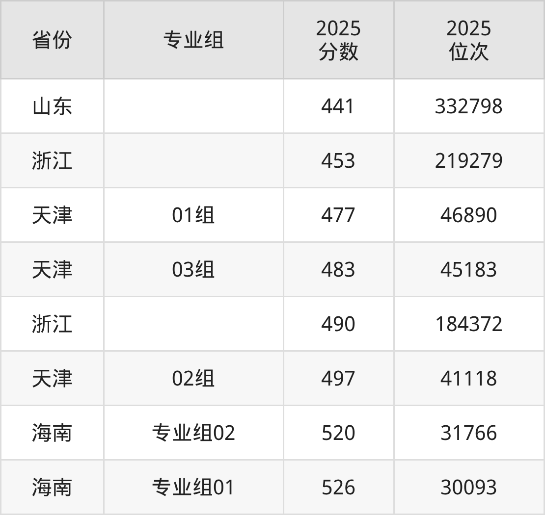最低分对应地区为山东,录取位次为332798;最高分对应地区为海南(专业组01),录取位次为30093,超本科线46分。