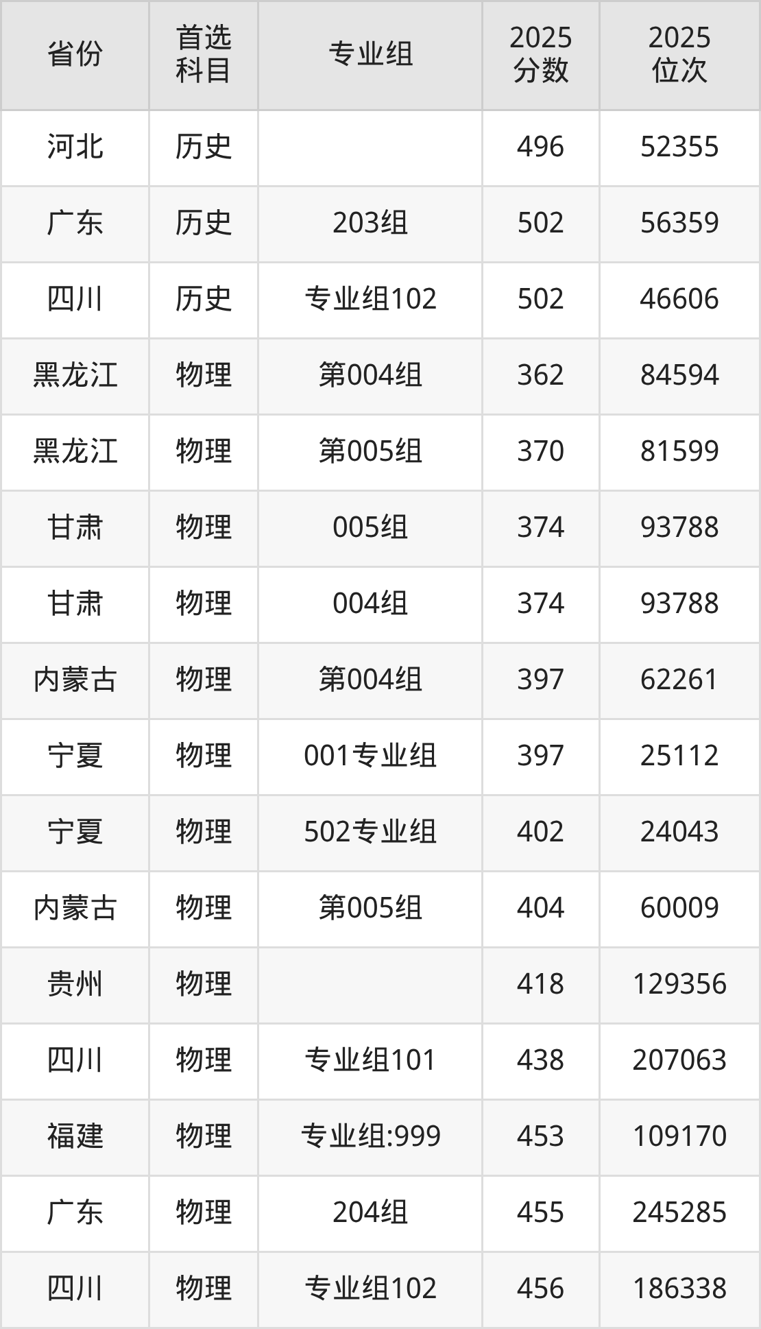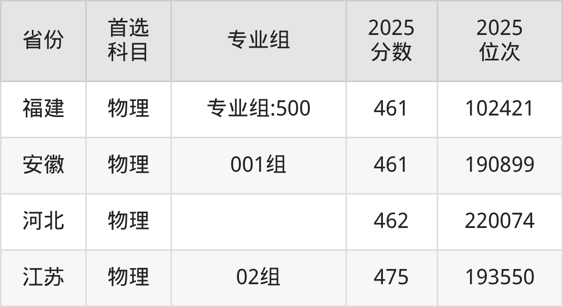 物理类最低分对应地区为黑龙江(第004组),录取位次为84594,超本科线2分;最高分对应地区为江苏(02组),录取位次为193550,超本科线12分。