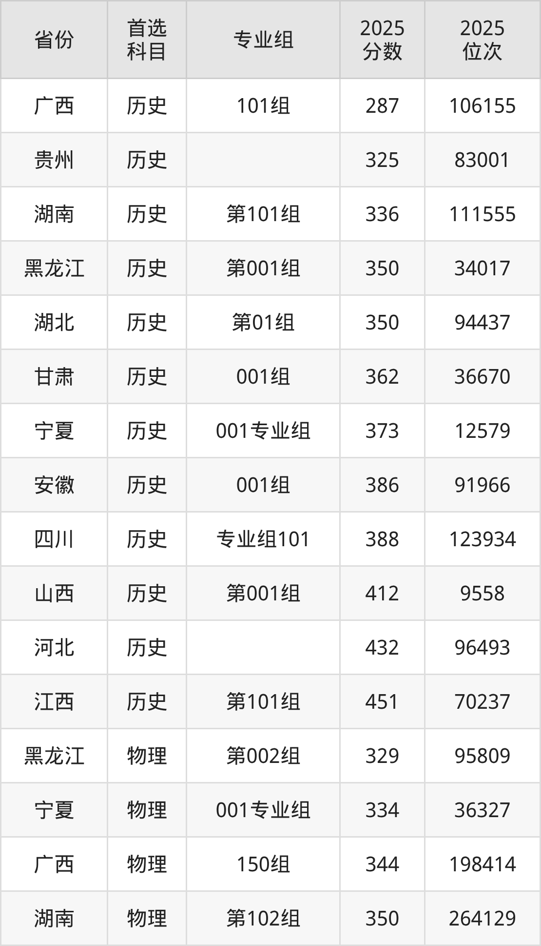 历史类最低分对应地区为广西(101组),录取位次为106155,超专科线87分;最高分对应地区为江西(第101组),录取位次为70237,超专科线161分。