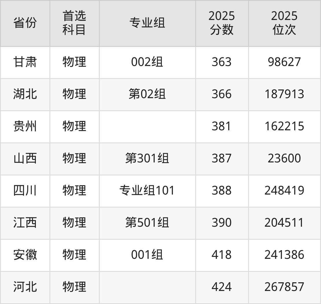 物理类最低分对应地区为黑龙江(第002组),录取位次为95809,超专科线169分;最高分对应地区为河北,录取位次为267857,超专科线224分。