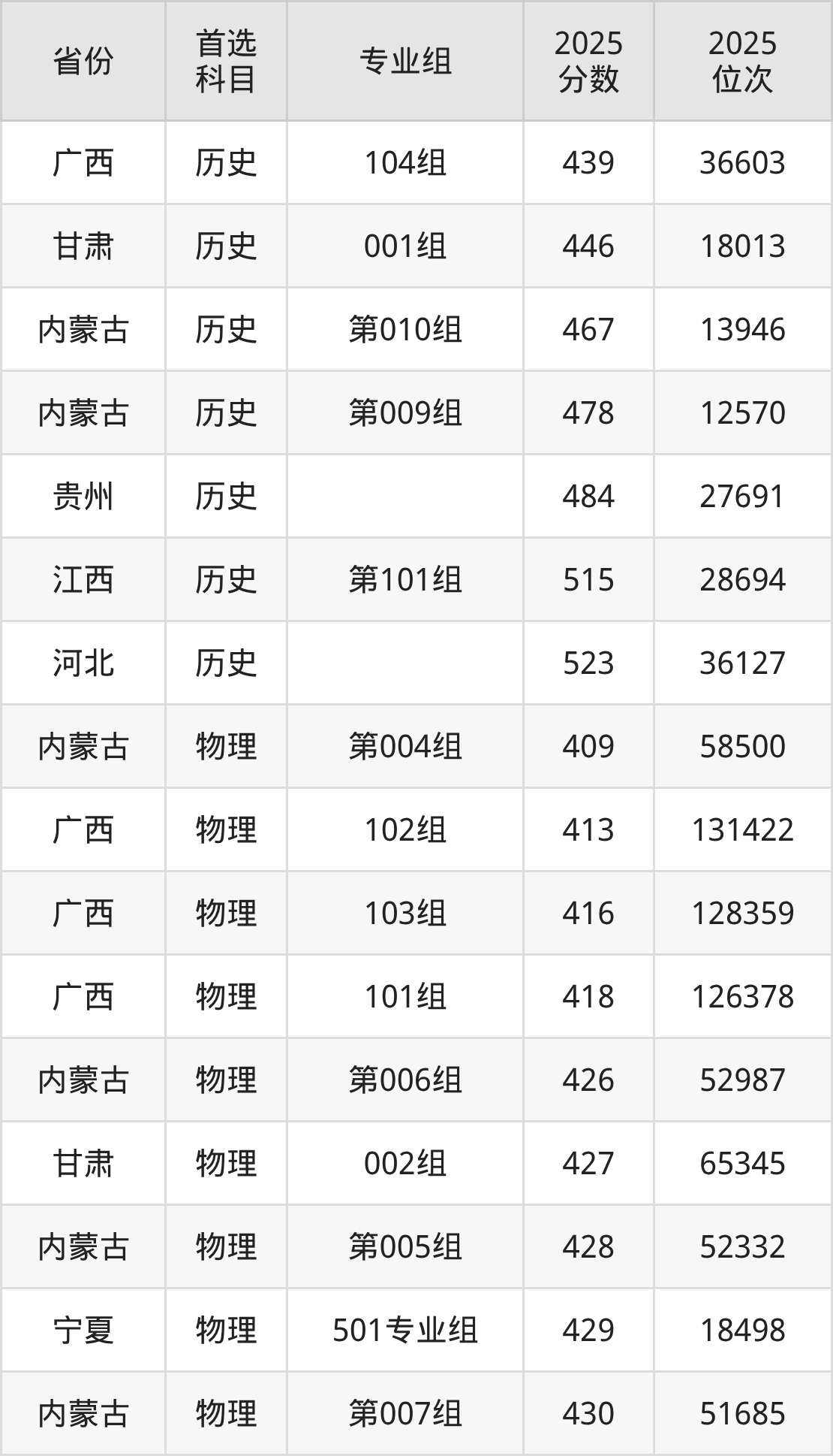 历史类最低分对应地区为广西(104组),录取位次为36603,超本科线37分;最高分对应地区为河北,录取位次为36127,超本科线46分。