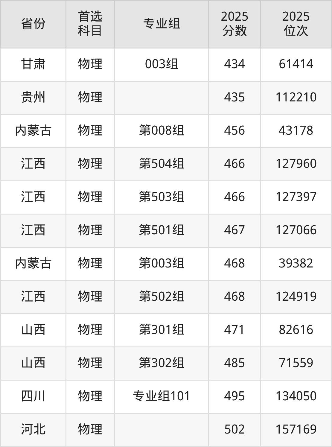 物理类最低分对应地区为内蒙古(第004组),录取位次为58500,超本科线34分;最高分对应地区为河北,录取位次为157169,超本科线65分。