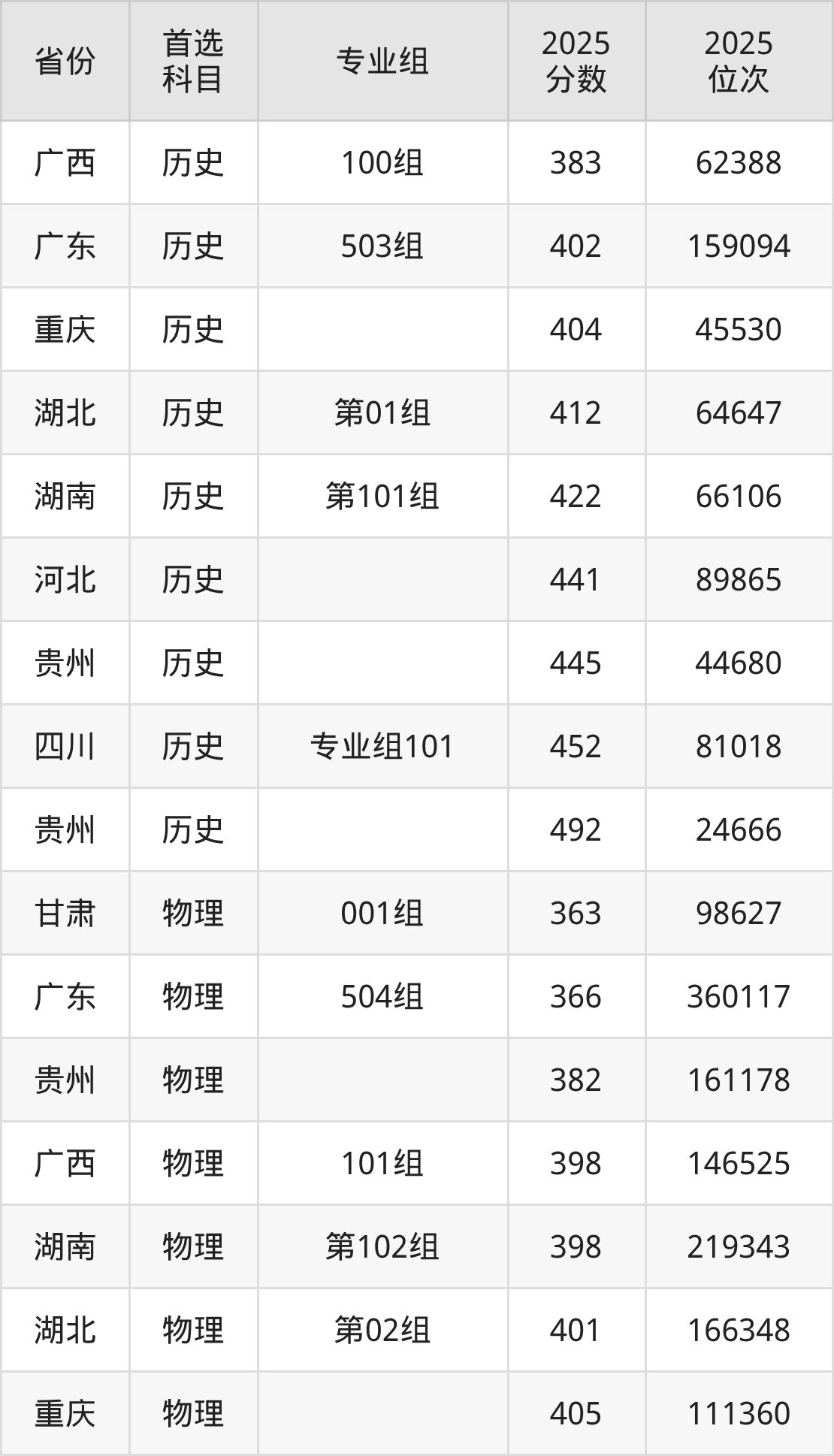 历史类最低分对应地区为广西(100组),录取位次为62388,超专科线183分;最高分对应地区为贵州,录取位次为24666,超本科线34分。