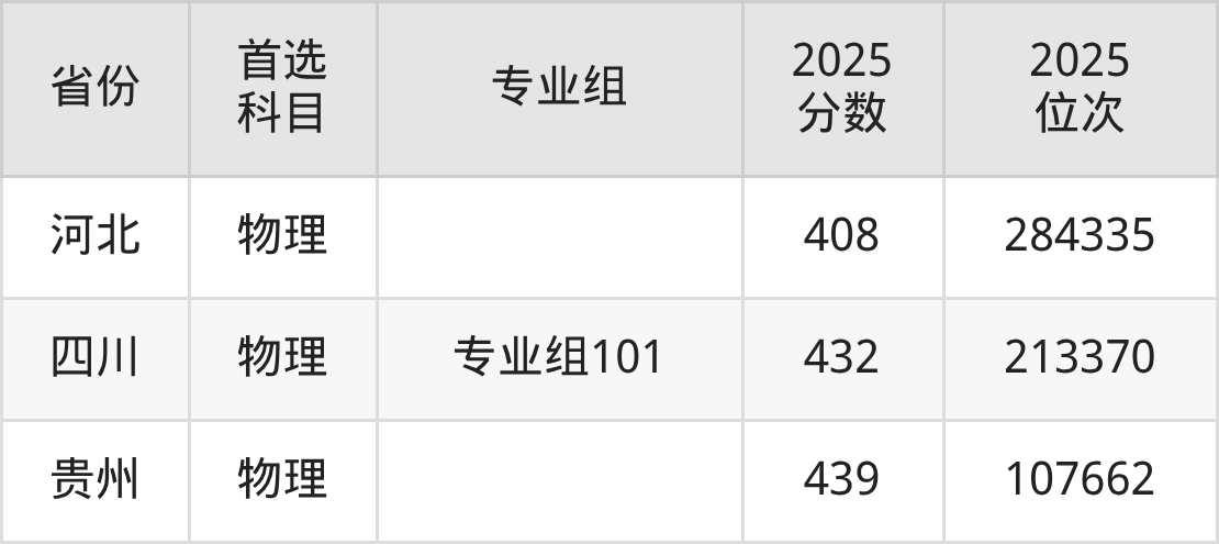 物理类最低分对应地区为甘肃(001组),录取位次为98627,超专科线183分;最高分对应地区为贵州,录取位次为107662,超本科线52分。