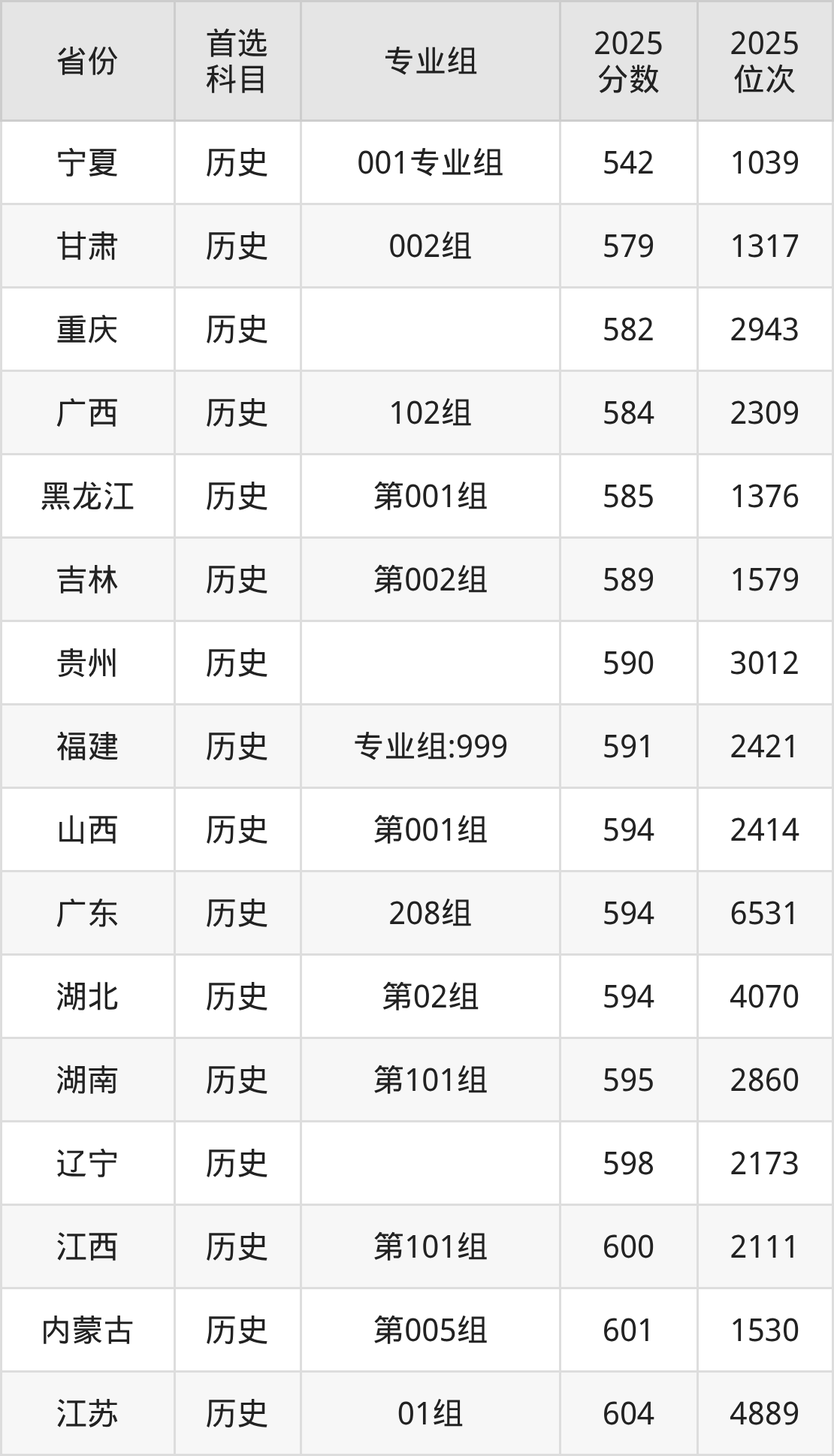 历史类最低分对应地区为宁夏(001专业组),录取位次为1039,超本科B138分;最高分对应地区为河北,录取位次为2777,超本科线141分。