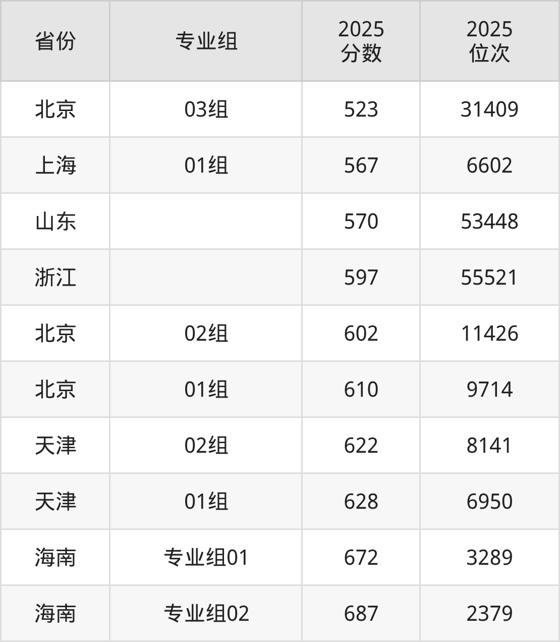 最低分对应地区为北京(03组),录取位次为31409,超本科线93分;最高分对应地区为海南(专业组02),录取位次为2379,超本科线207分。