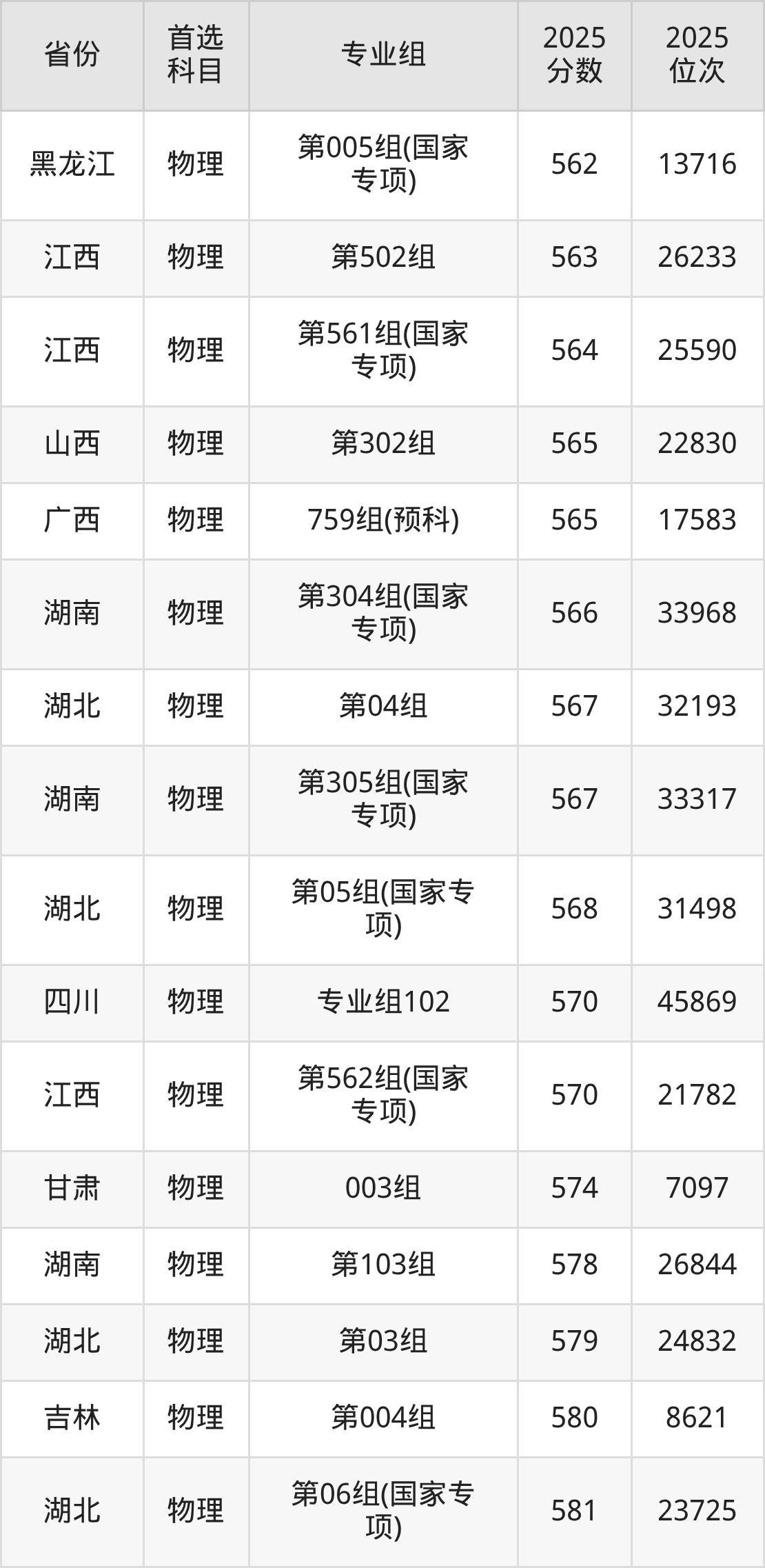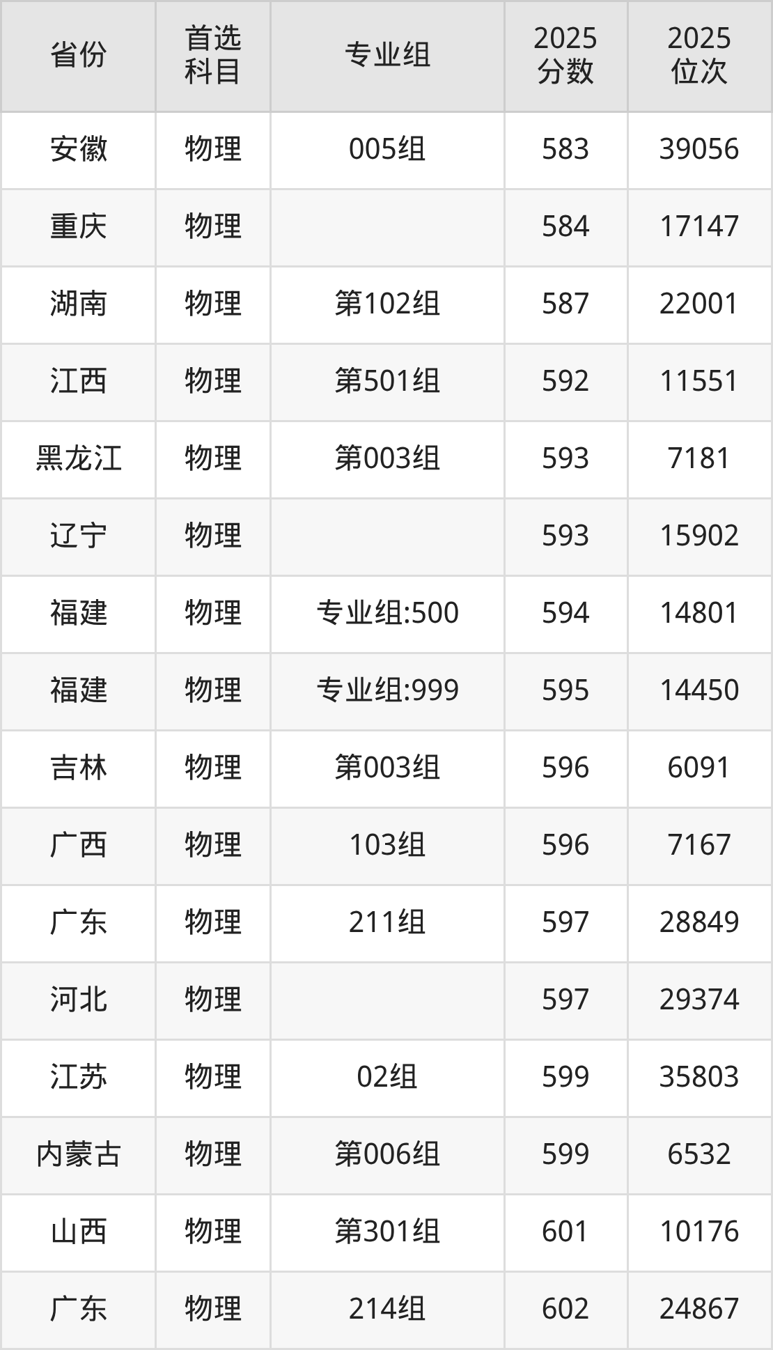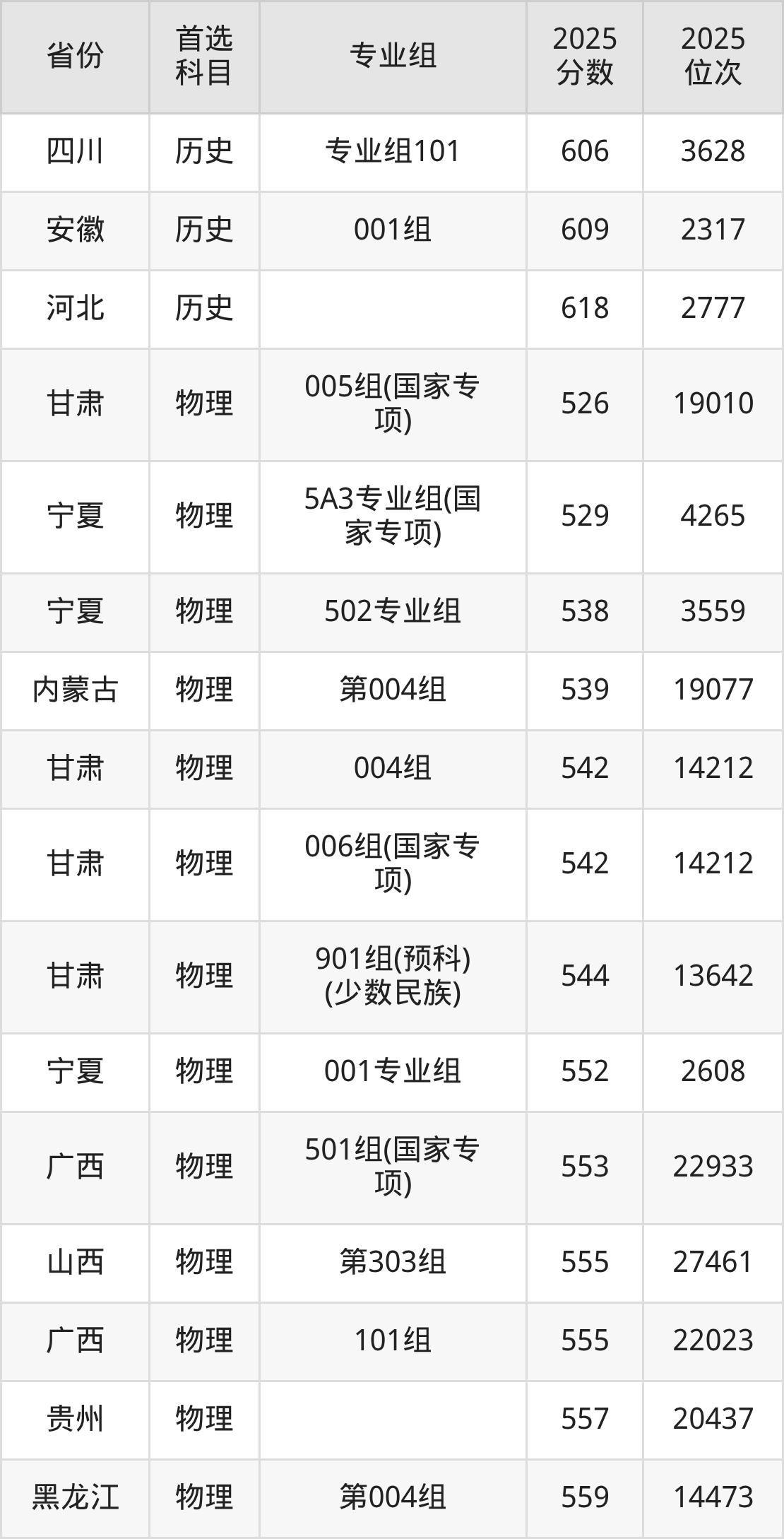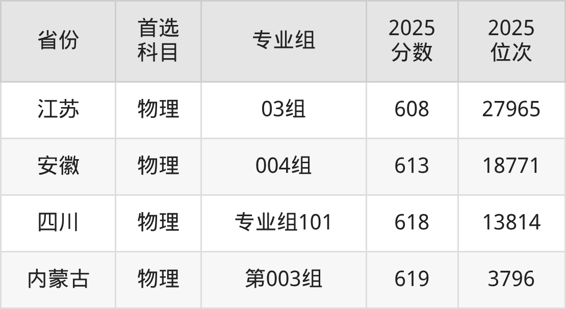 物理类最低分对应地区为甘肃(005组(国家专项)),录取位次为19010,超本科线152分;最高分对应地区为内蒙古(第003组),录取位次为3796,超本科线244分。