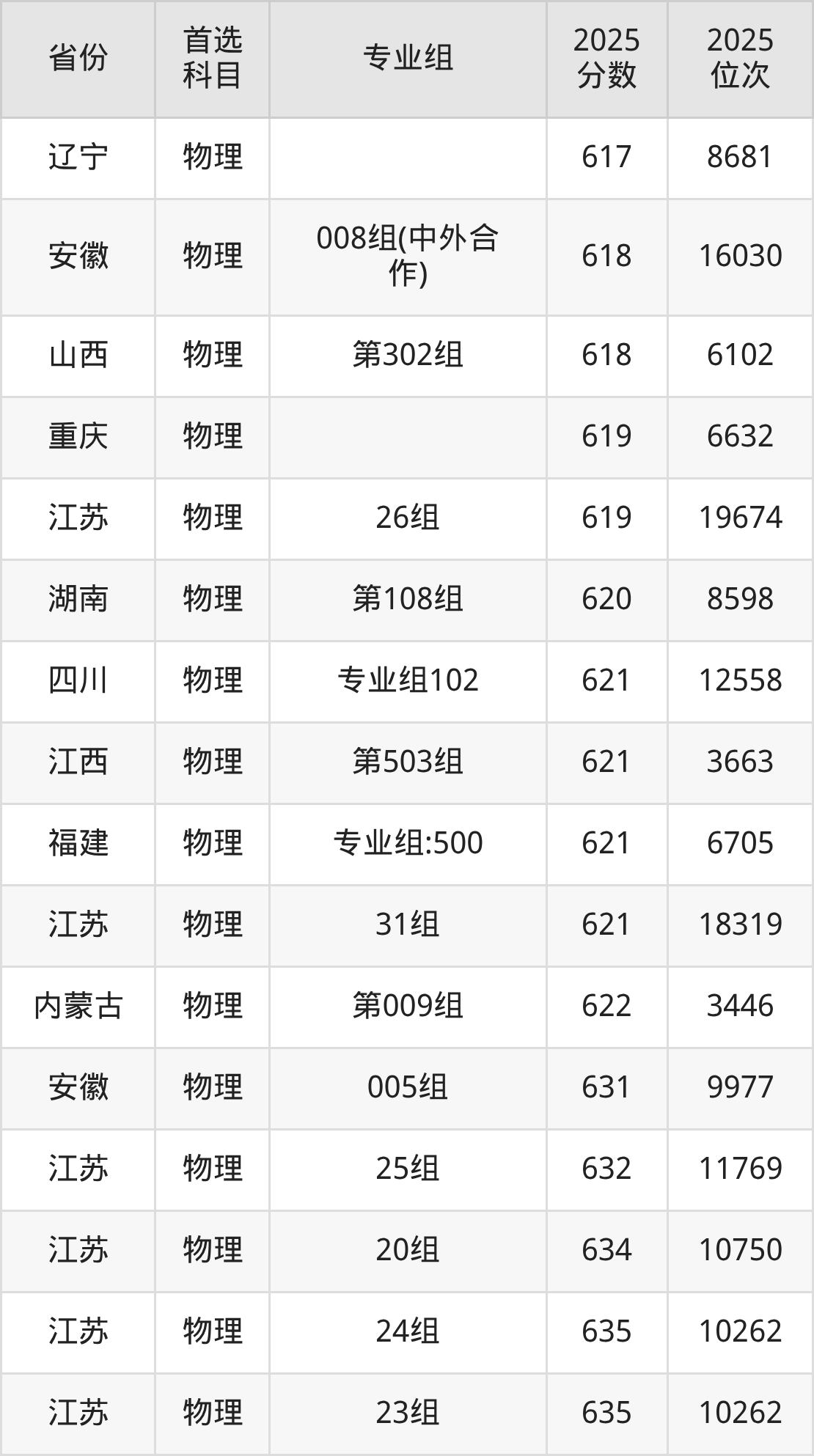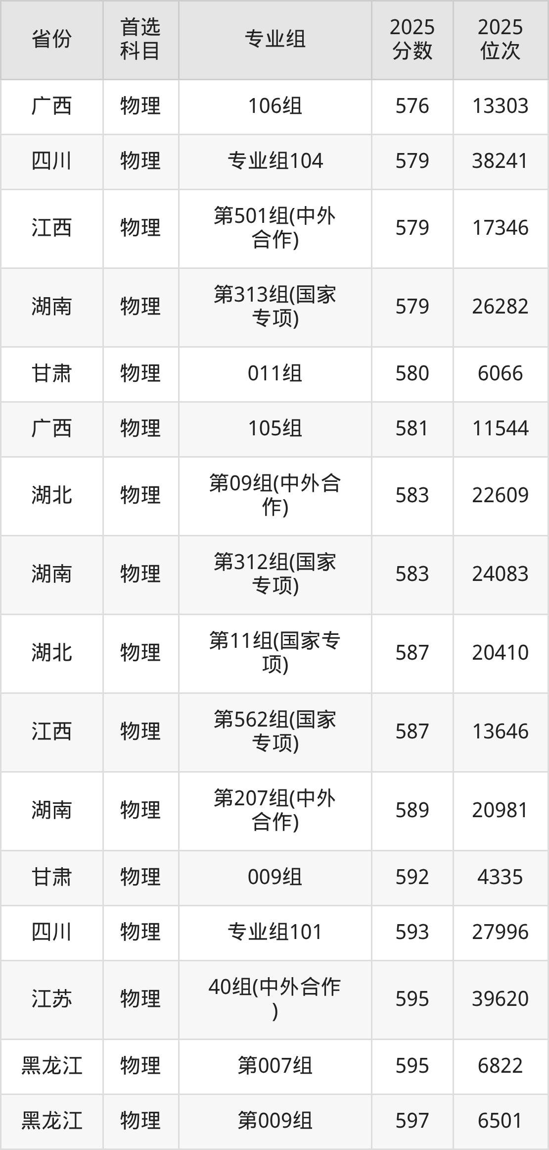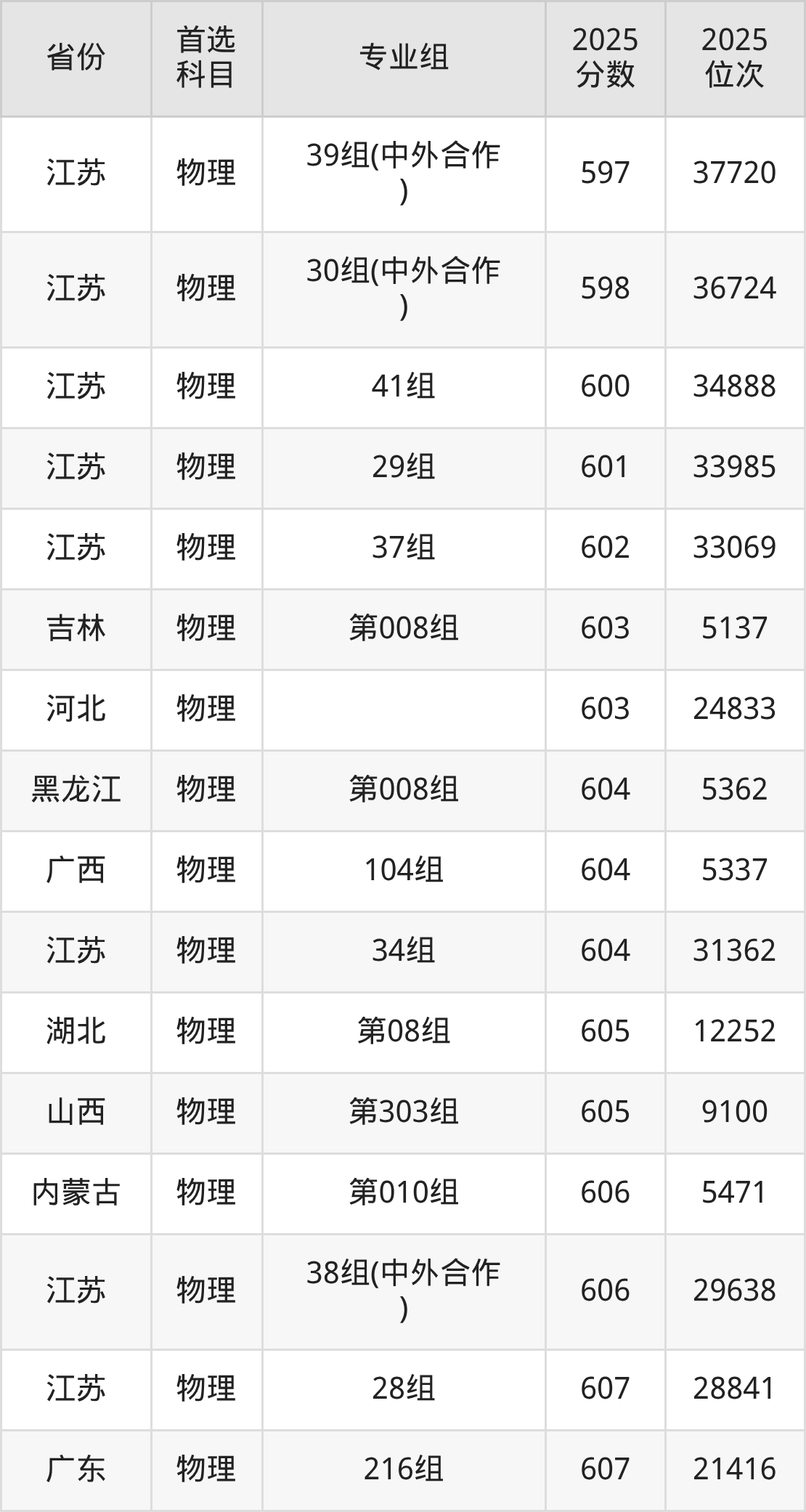 物理类:13组634分、9941名,14组634分、9941名,15组645分、5946名,16组632分、10759名,17组634分、9941名,18组633分、10323名,19组630分、11630名,20组617分、18491名,21组625分、14098名,22组600分、29983名,23组597分、32342名,24组(中外合作)595分、33981名,25组620分、16768名,26组612分、21589名,27组606分、25606名,28组598分、31528名,29组621分、16228名,30组611分、22222名,31组(中外合作)600分、29983名,32组(中外合作)590分、38211名,33组(中外合作)589分、39110名,34组601分、29207名;