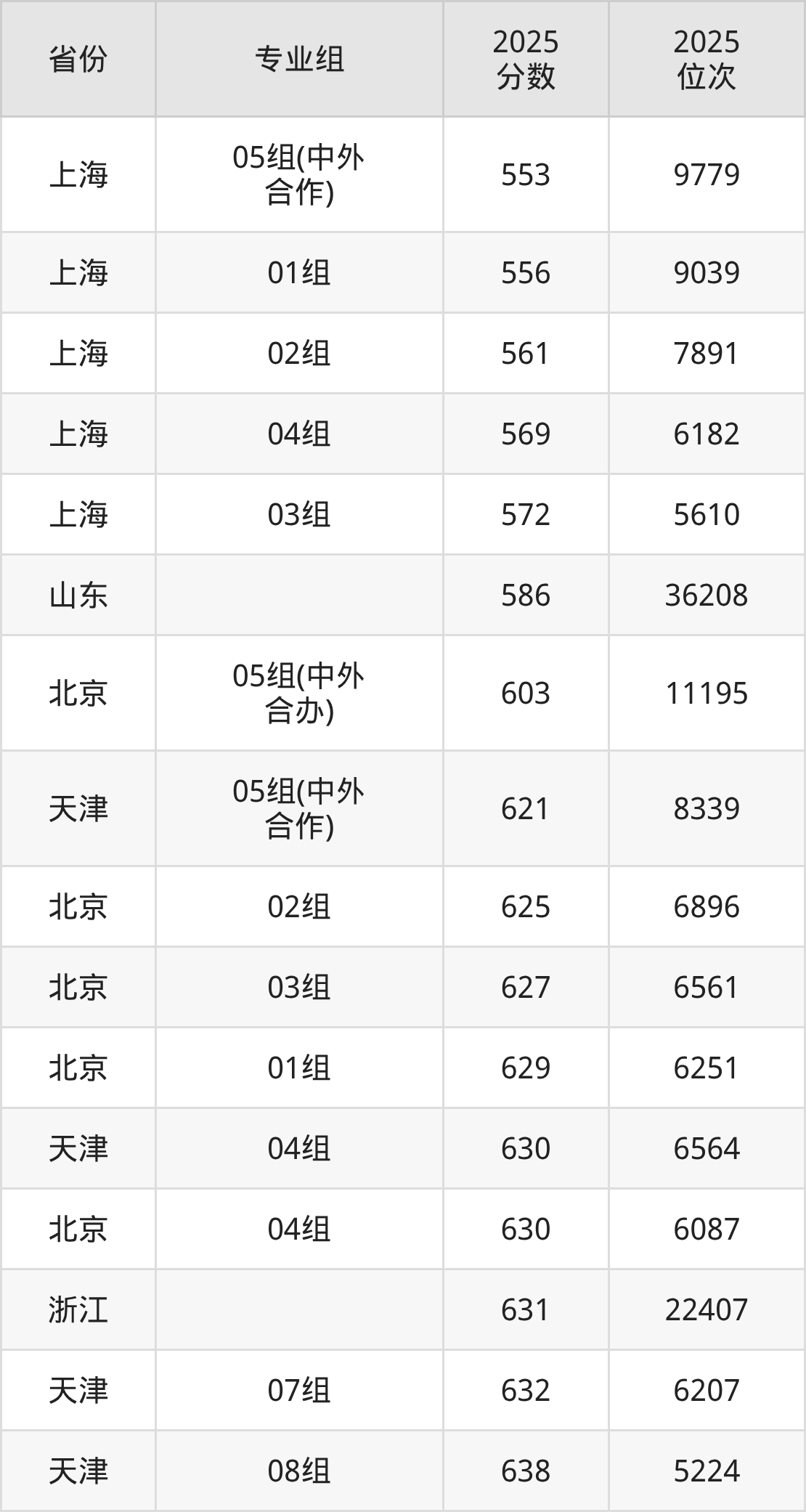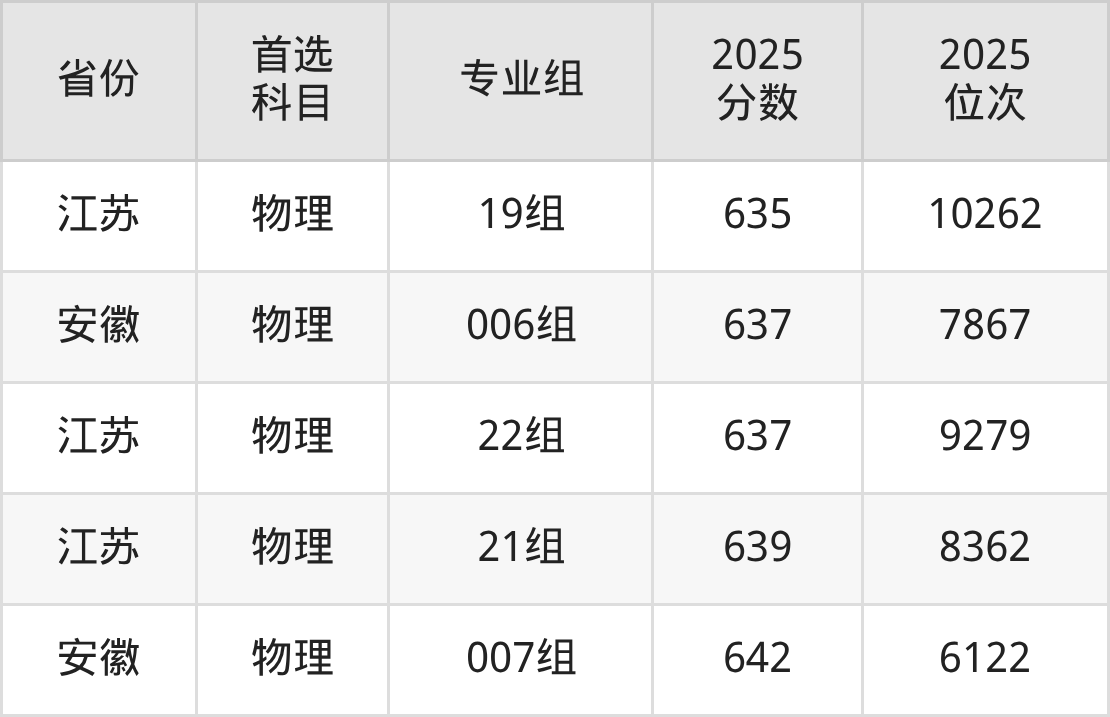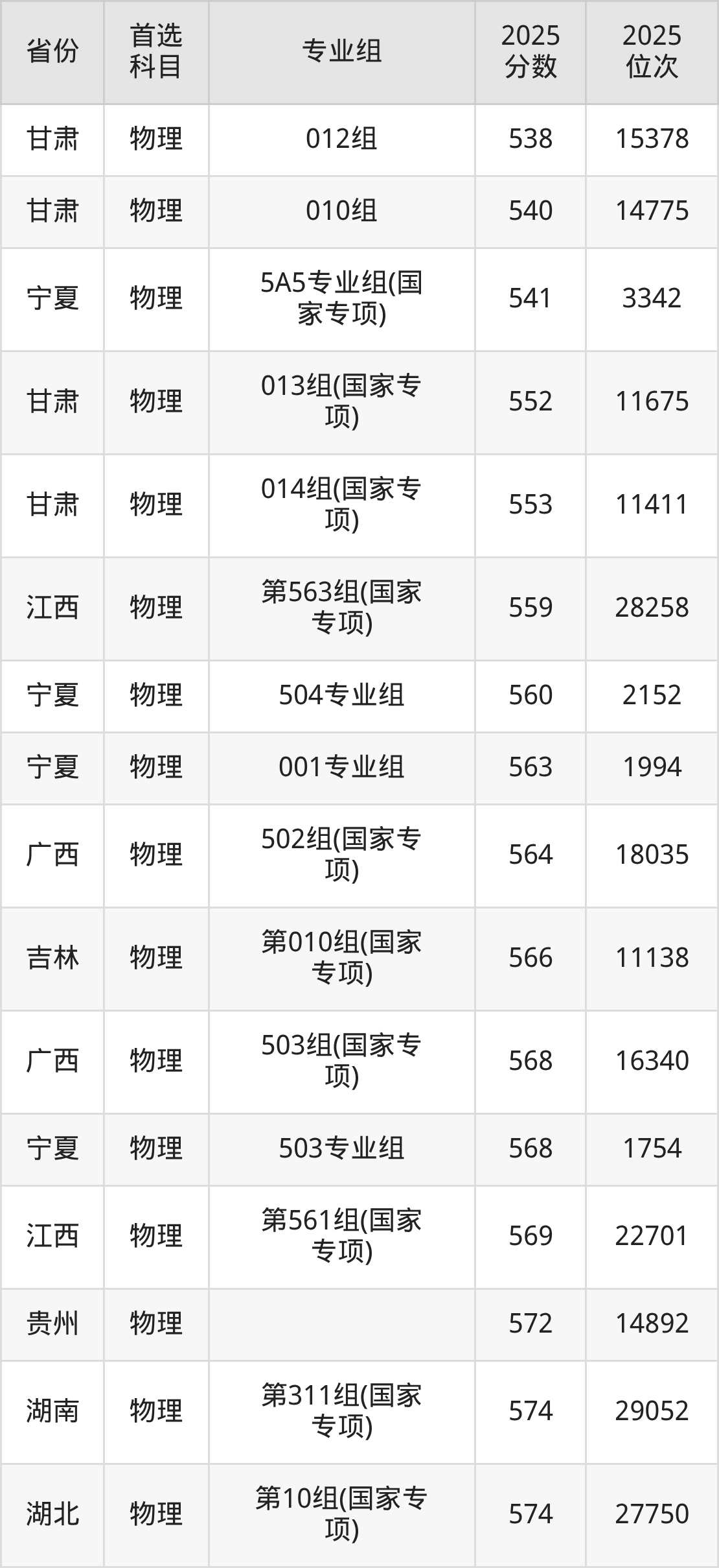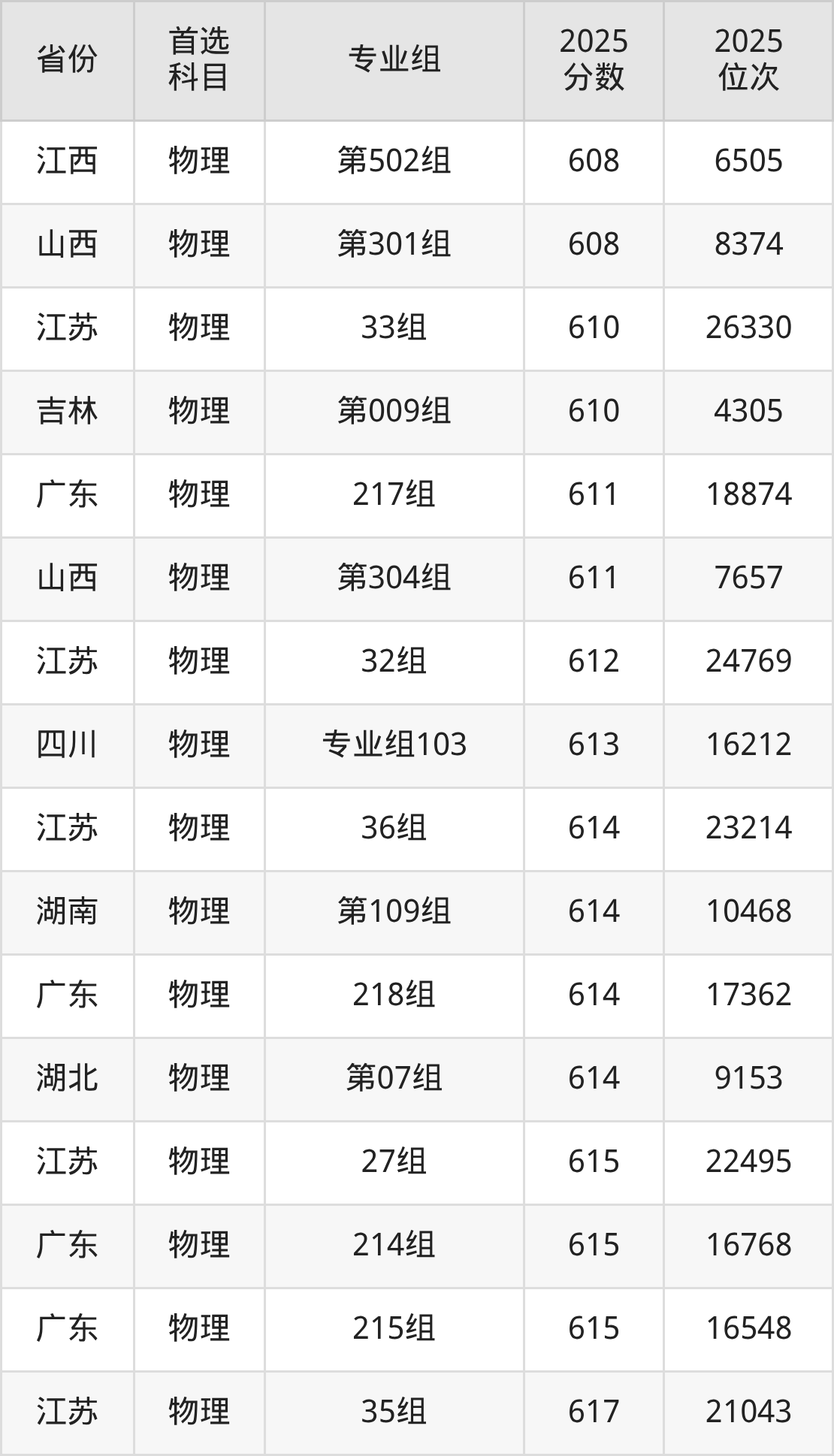 物理类:13组634分、9941名,14组634分、9941名,15组645分、5946名,16组632分、10759名,17组634分、9941名,18组633分、10323名,19组630分、11630名,20组617分、18491名,21组625分、14098名,22组600分、29983名,23组597分、32342名,24组(中外合作)595分、33981名,25组620分、16768名,26组612分、21589名,27组606分、25606名,28组598分、31528名,29组621分、16228名,30组611分、22222名,31组(中外合作)600分、29983名,32组(中外合作)590分、38211名,33组(中外合作)589分、39110名,34组601分、29207名;