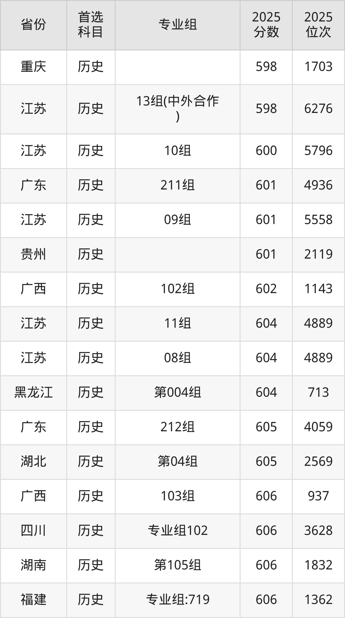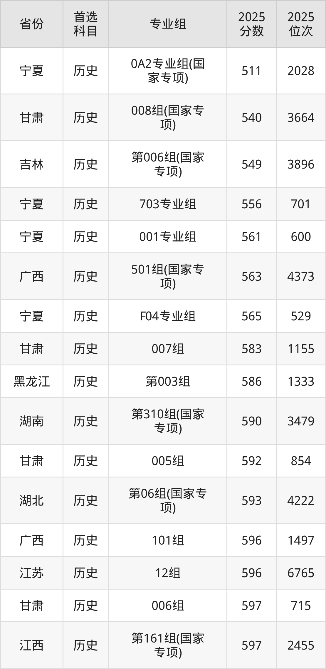 历史类:01组592分、5588名,02组550分、17664名,03组605分、3348名,04组595分、5035名,05组(中外合作)592分、5588名,06组(中外合作)579分、8530名,07组586分、6865名,08组605分、3348名;