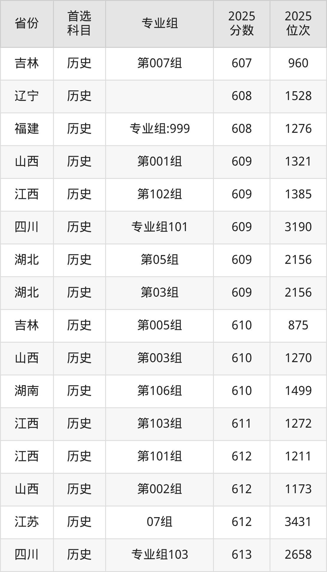 历史类:03组627分、1489名,04组622分、2030名,05组621分、2130名,06组614分、3092名,07组612分、3431名,08组604分、4889名,09组601分、5558名,10组600分、5796名,11组604分、4889名,12组596分、6765名,13组(中外合作)598分、6276名;