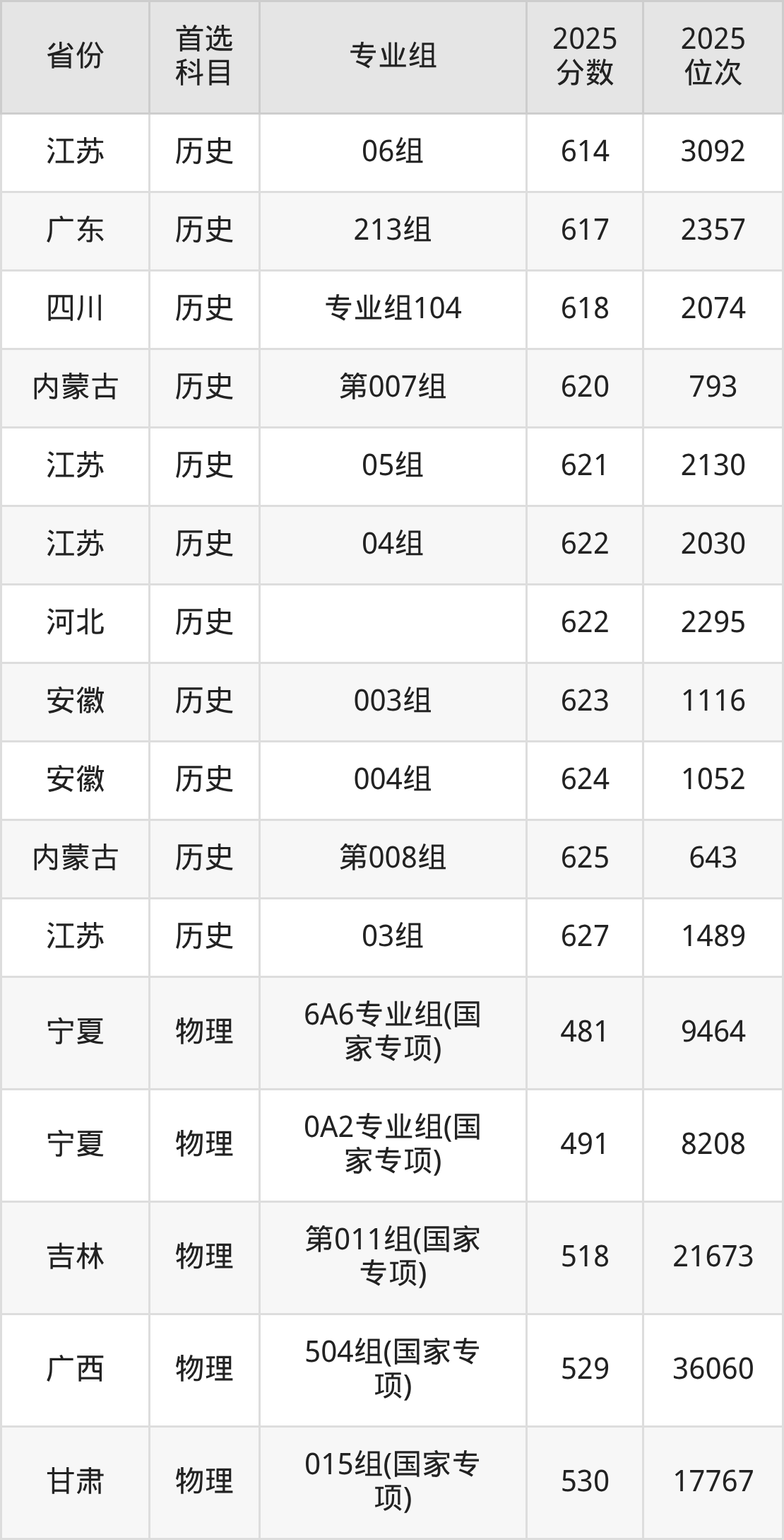 历史类最低分对应地区为宁夏(0A2专业组(国家专项)),录取位次为2028,超本科B107分;最高分对应地区为江苏(03组),录取位次为1489,超本科线145分。