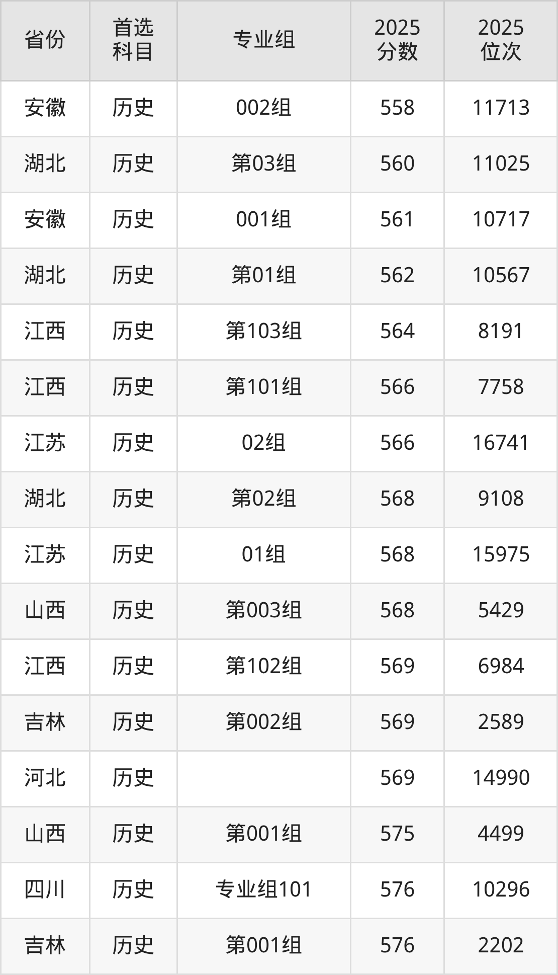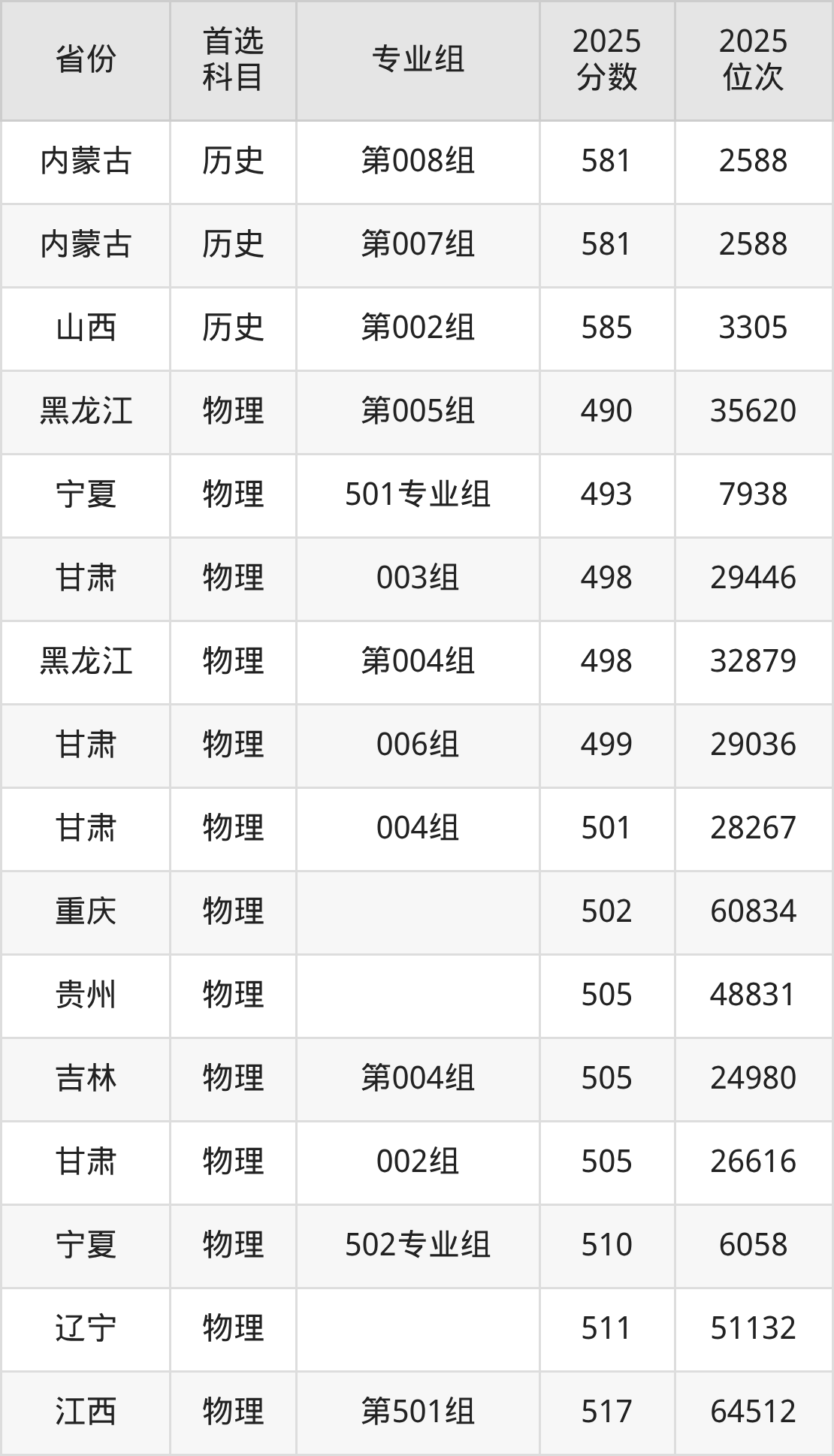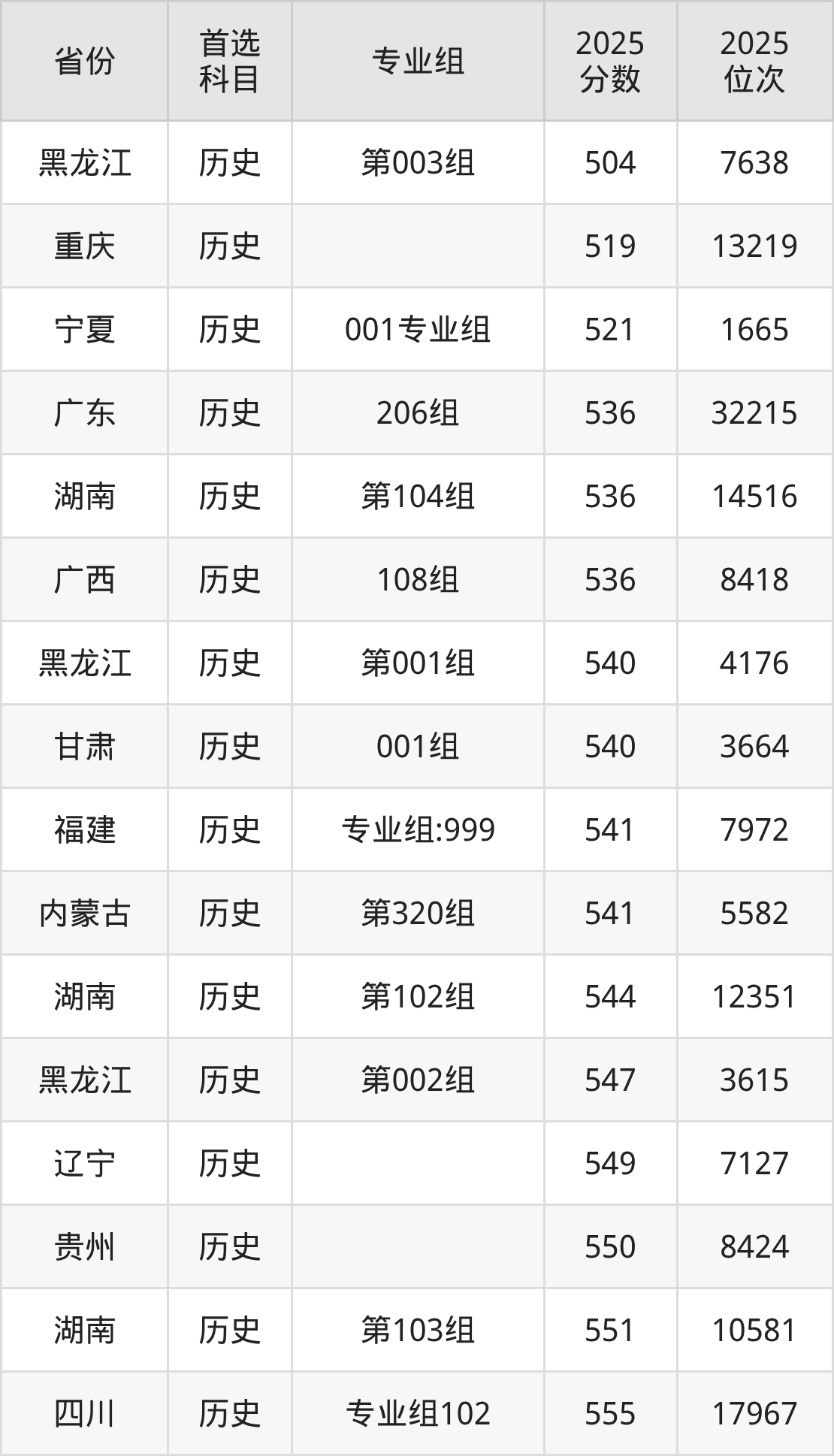 历史类最低分对应地区为黑龙江(第003组),录取位次为7638,超本科线99分;最高分对应地区为山西(第002组),录取位次为3305,超本科线142分。