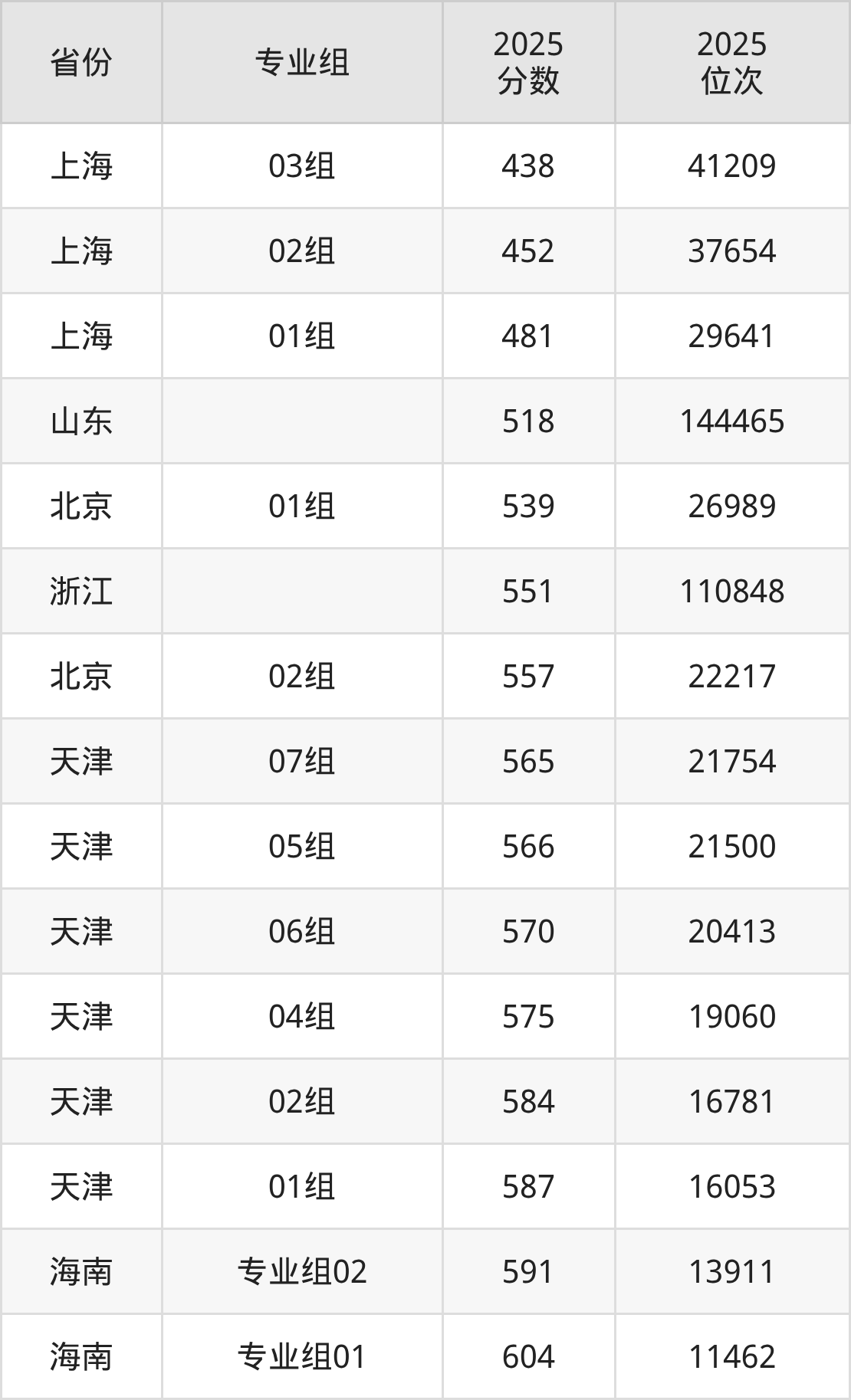 最低分对应地区为上海(03组),录取位次为41209,超本科线36分;最高分对应地区为海南(专业组01),录取位次为11462,超本科线124分。