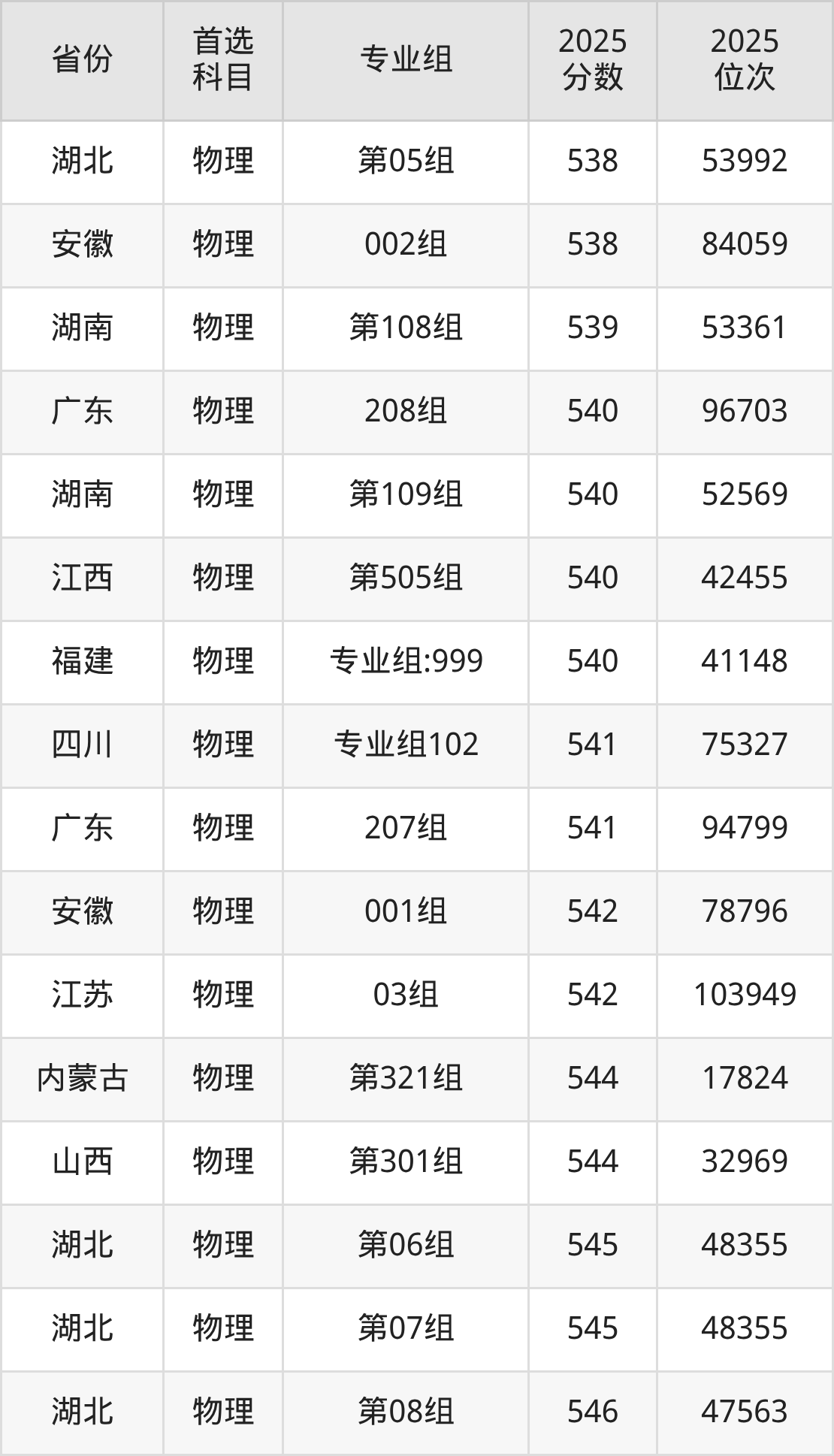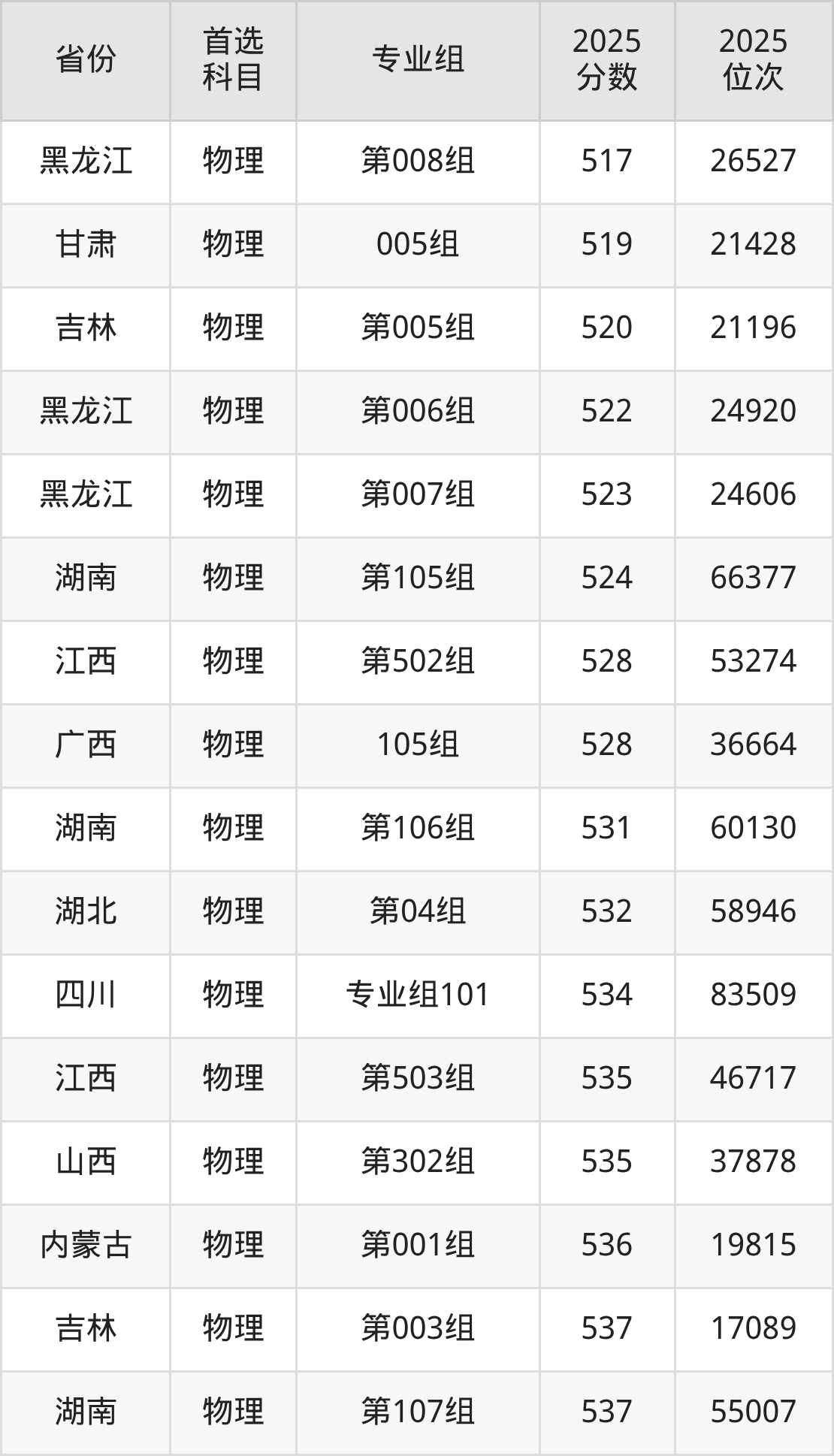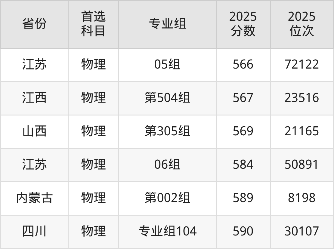 物理类最低分对应地区为黑龙江(第005组),录取位次为35620;最高分对应地区为四川(专业组104),录取位次为30107,超本科B152分。