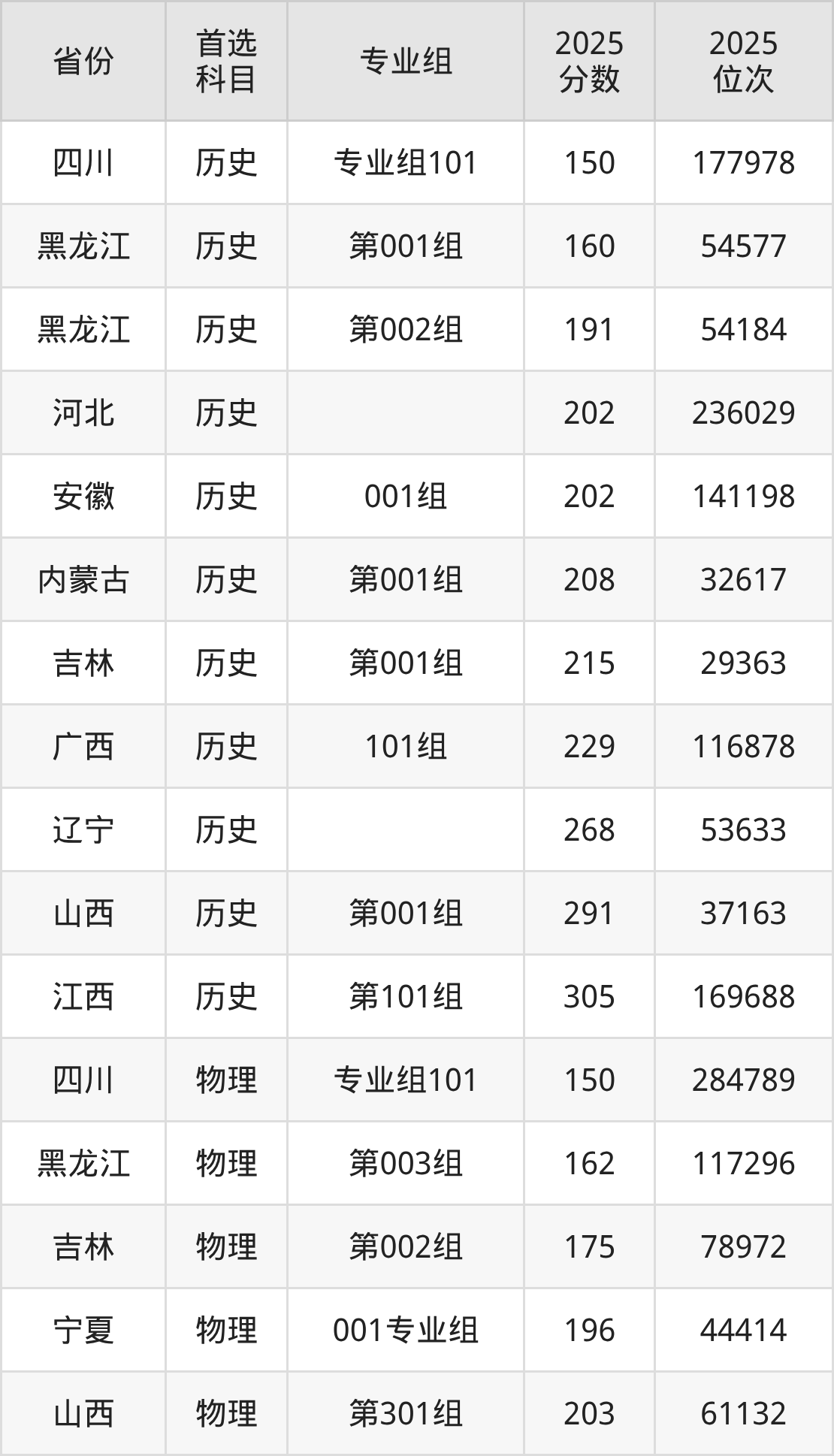 历史类最低分对应地区为四川(专业组101),录取位次为177978;最高分对应地区为江西(第101组),录取位次为169688,超专科线15分。